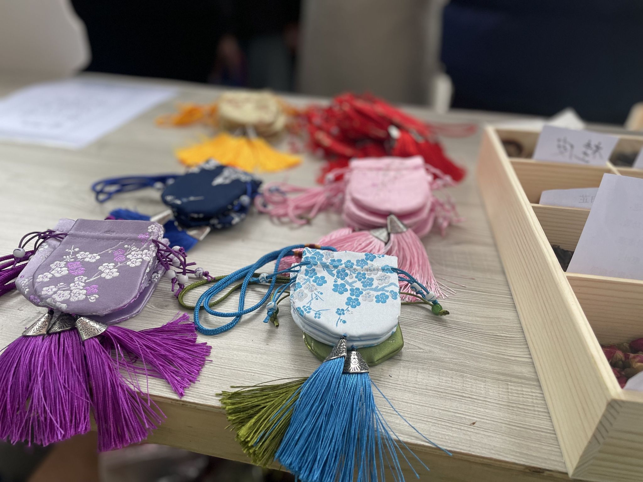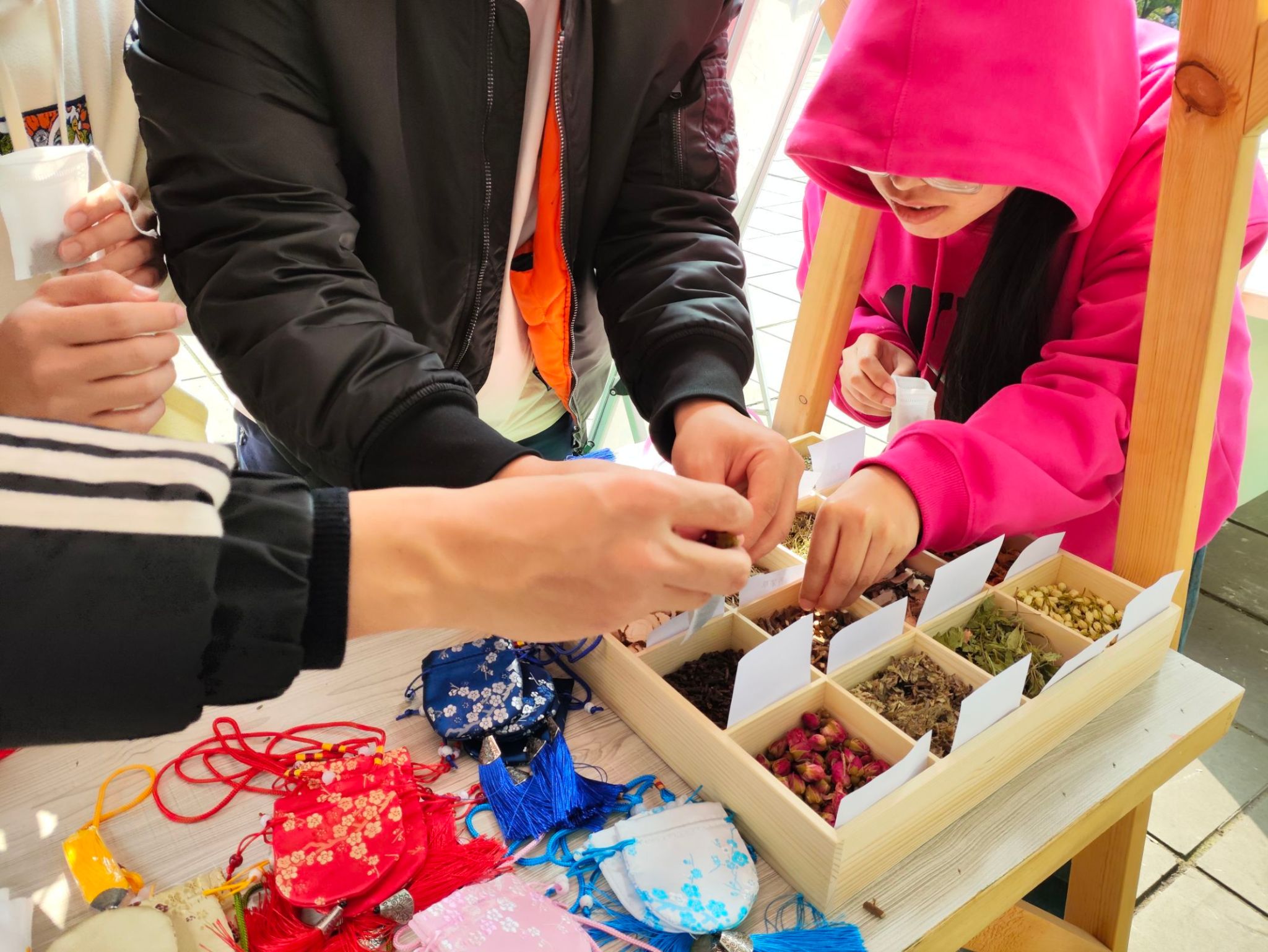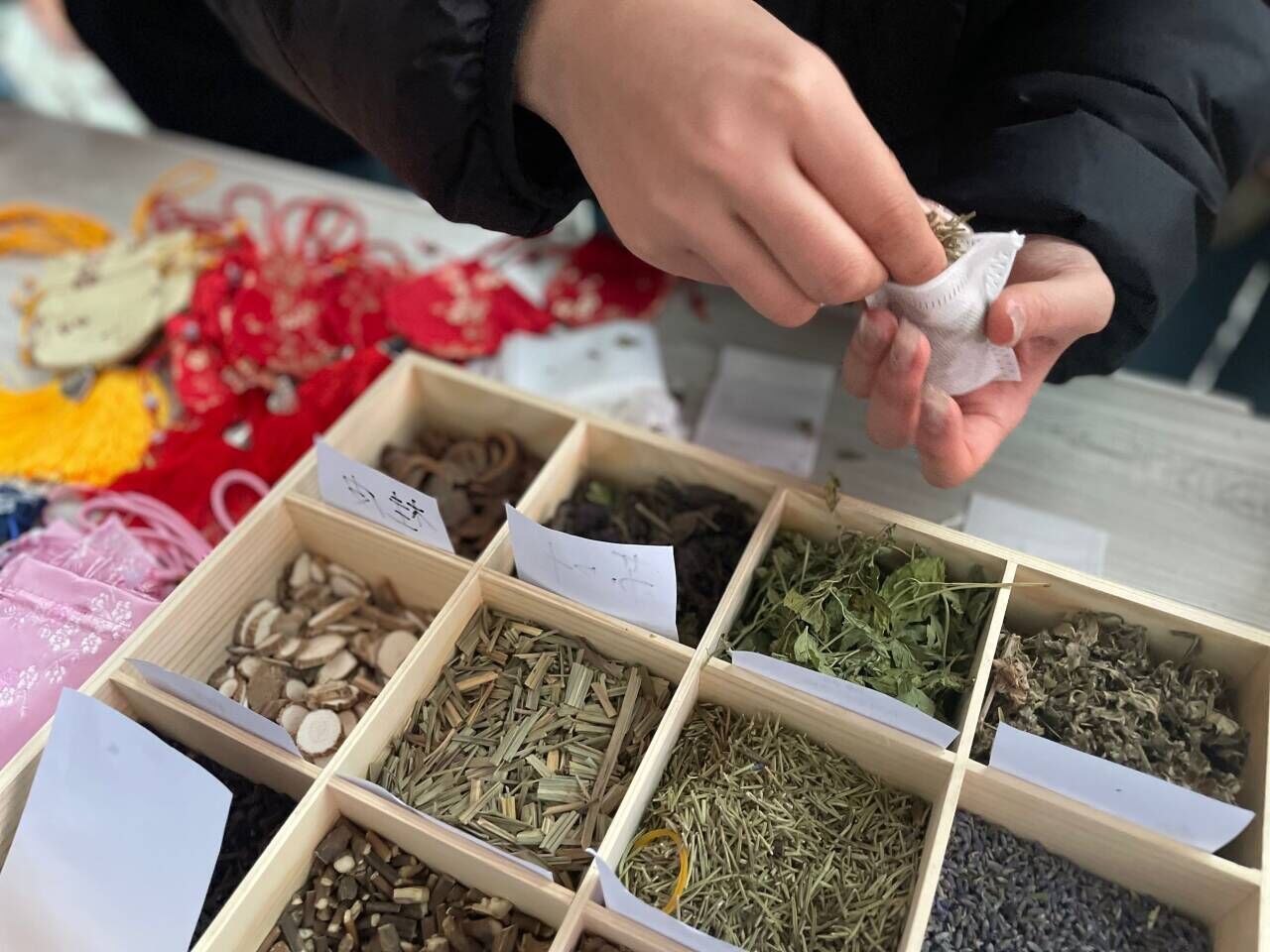 “香囊里藏花香佳,清香扑鼻入人怀。” 香囊自古以来一直与女性紧密相连,作为古代女性必备之物之一,不仅承载了汉族独特的染织绣等杰出工艺和美学,更是一种充满养生之道的载体。活动尚未开始,然而药草的芬芳早已吸引了众多同学的关注。现场摆放着16种中草药,如艾草、迷迭香、白芷、丁香等,每种草药旁边都贴心地附有卡片,介绍着草药的功效。这样的设计让同学们在制作香囊时可以根据自己的喜好选择草药,既能增进对中医药知识的了解,又能亲手制作属于自己的小香囊,制作过程中体会中华优秀传统文化的魅力。整个现场弥漫着一股幽香,仿佛让人置身于芳草馥郁的园林之中。