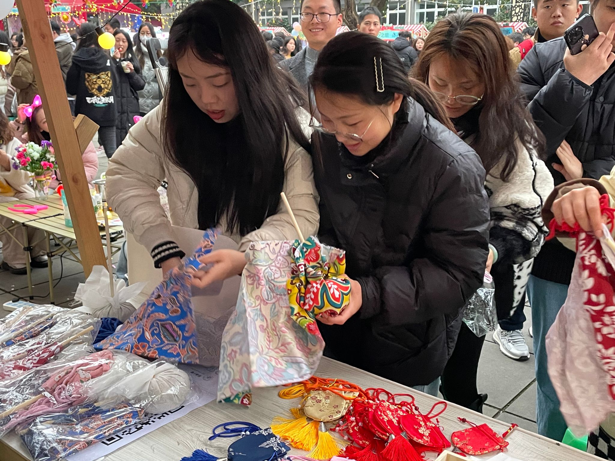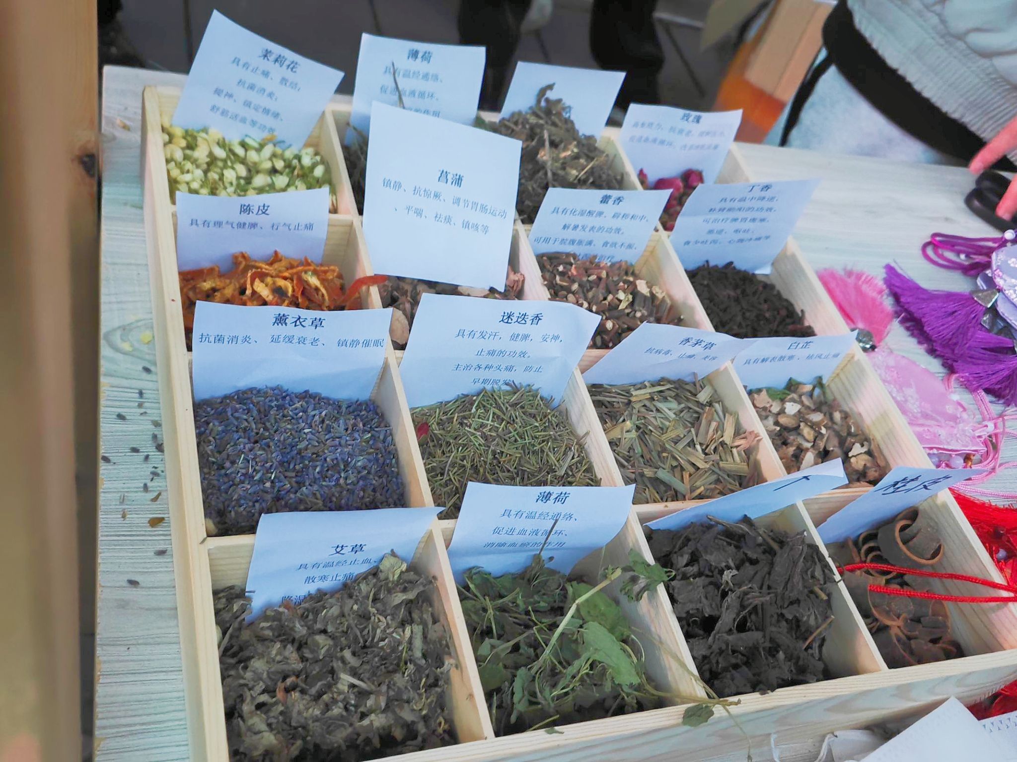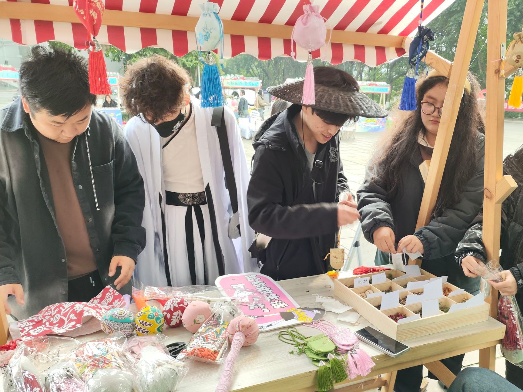 “香囊里藏花香佳,清香扑鼻入人怀。” 香囊自古以来一直与女性紧密相连,作为古代女性必备之物之一,不仅承载了汉族独特的染织绣等杰出工艺和美学,更是一种充满养生之道的载体。活动尚未开始,然而药草的芬芳早已吸引了众多同学的关注。现场摆放着16种中草药,如艾草、迷迭香、白芷、丁香等,每种草药旁边都贴心地附有卡片,介绍着草药的功效。这样的设计让同学们在制作香囊时可以根据自己的喜好选择草药,既能增进对中医药知识的了解,又能亲手制作属于自己的小香囊,制作过程中体会中华优秀传统文化的魅力。整个现场弥漫着一股幽香,仿佛让人置身于芳草馥郁的园林之中。