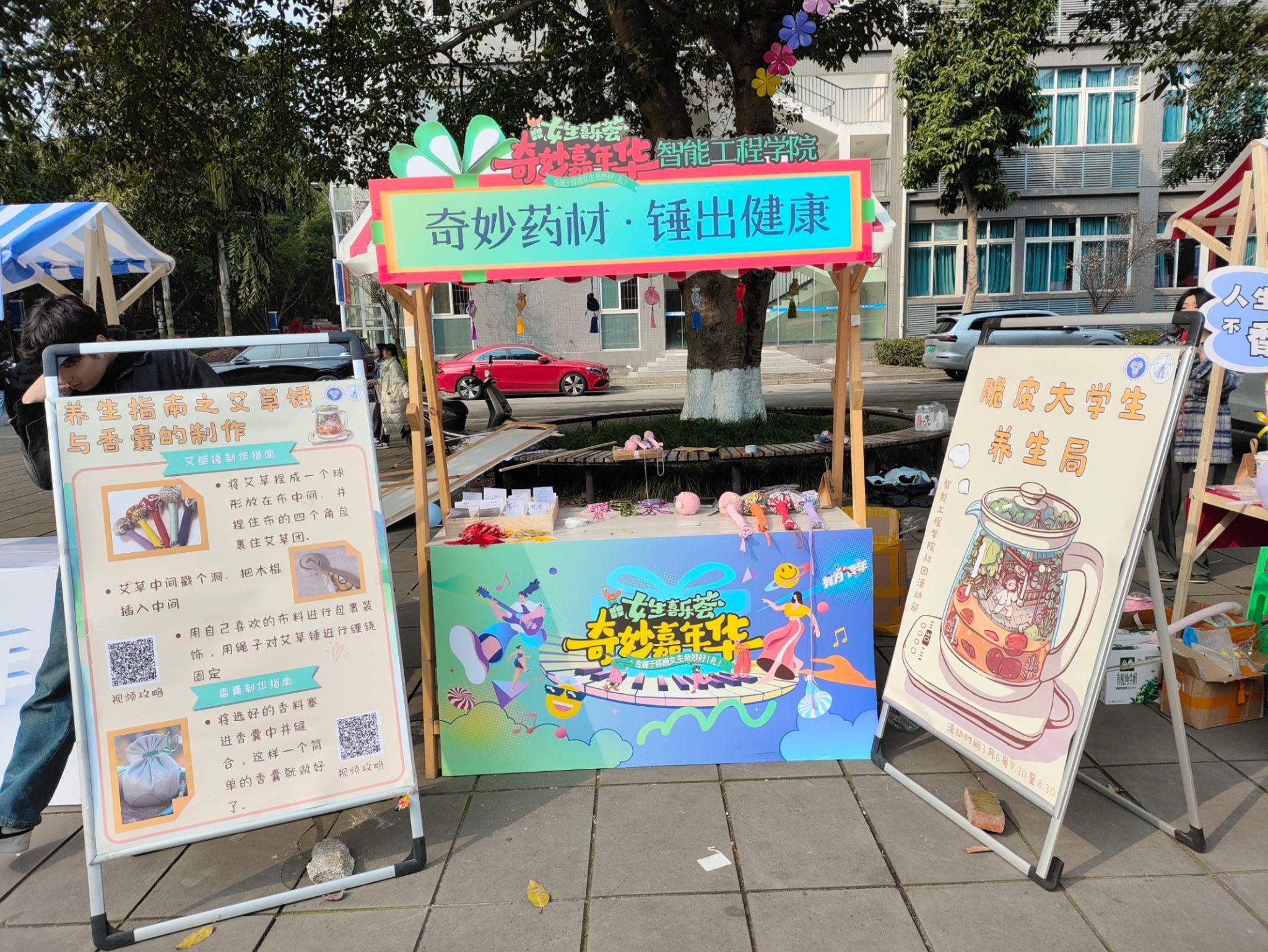 一路烟霞,莺飞草长,三月春花渐次醒,满枝迎春。为了丰富校园文化生活,展示新时代女大学生风采,培养积极乐观的阳光心态,促进身心健康发展,营造积极有爱的校园氛围。智能工程学院社团活动部于2024年3月6日在黄桷树广场举办“脆皮大学生·养生局”为主题的女生节子活动。