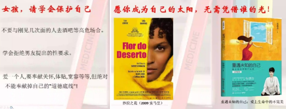 一是“性教育是保护的第一道盔甲”。及时给孩子渗透性教育才是对他们最大的保护,在生活中性教育会缺失,但永远不会缺席。二是“懂得自尊自爱”。自尊的意义首先是接纳自己,接受自己的一切。在成长环境中获得足够安全感的孩子,不会轻易抛弃尊严迎合任何人;被父母充分肯定喝接纳的孩子,不会再被他人侵害后,把责任归结于自己。三是“树立正确的爱情观”,畸形可怖的不伦关系并不是爱情,爱情也不是巧言令色的伤害,只有获得心理和生理双层的舒适感的感情才是所谓的爱情。四是“学会愤怒,勇敢反抗”。老师为我们讲解到在受到侵害时忍耐并不是美德,勇于反抗是挣脱梦魇的唯一选择。