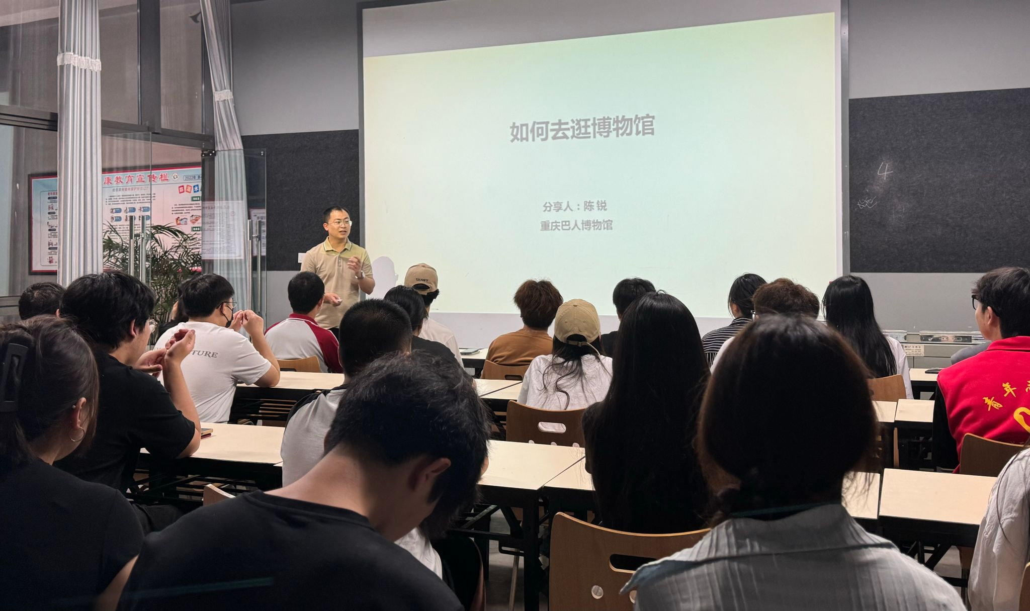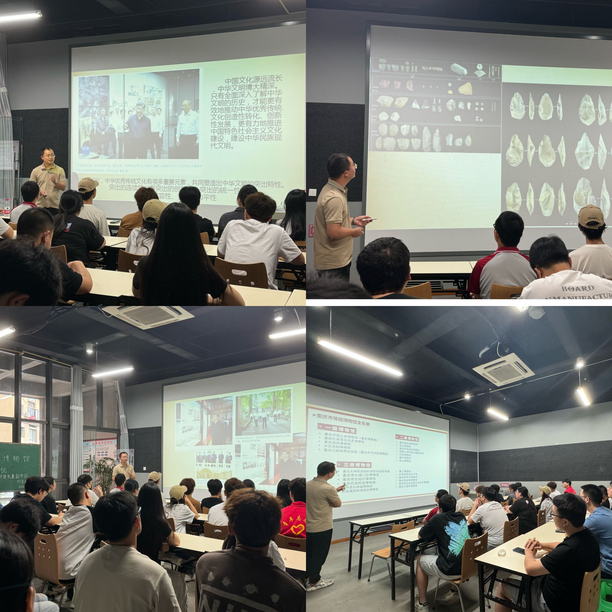 在讲座上,陈锐老师谈到中华文化源远流长,中华文明博大精深,中华优秀传统文化有很多重要元素,共同塑造出了中华文明的突出特性。同时指出中华民族现代文明的建设离不开全面深入地了解中华文明的历史。文化是一个国家的软实力,文明的兴旺一定程度上也影响着国家的繁荣。对于博物馆,陈锐老师提到了《定名与相知—博物馆参观记》这本书,向大家普及物质文化遗产的划分,即何为有形物质文化遗产,何为无形文化遗产。老师还谈到考古学的重要性以及考古学文化,通过展示不同历史时期各种各样的历史文物,通俗易懂地讲述图片中一些历史事件、历史故事以及自己的切身感受。老师还介绍了重庆市等级博物馆名单,着重介绍了一些博物馆的历史文化,如讲述巴南博物馆、巫山博物馆中的文物或现存遗址。
