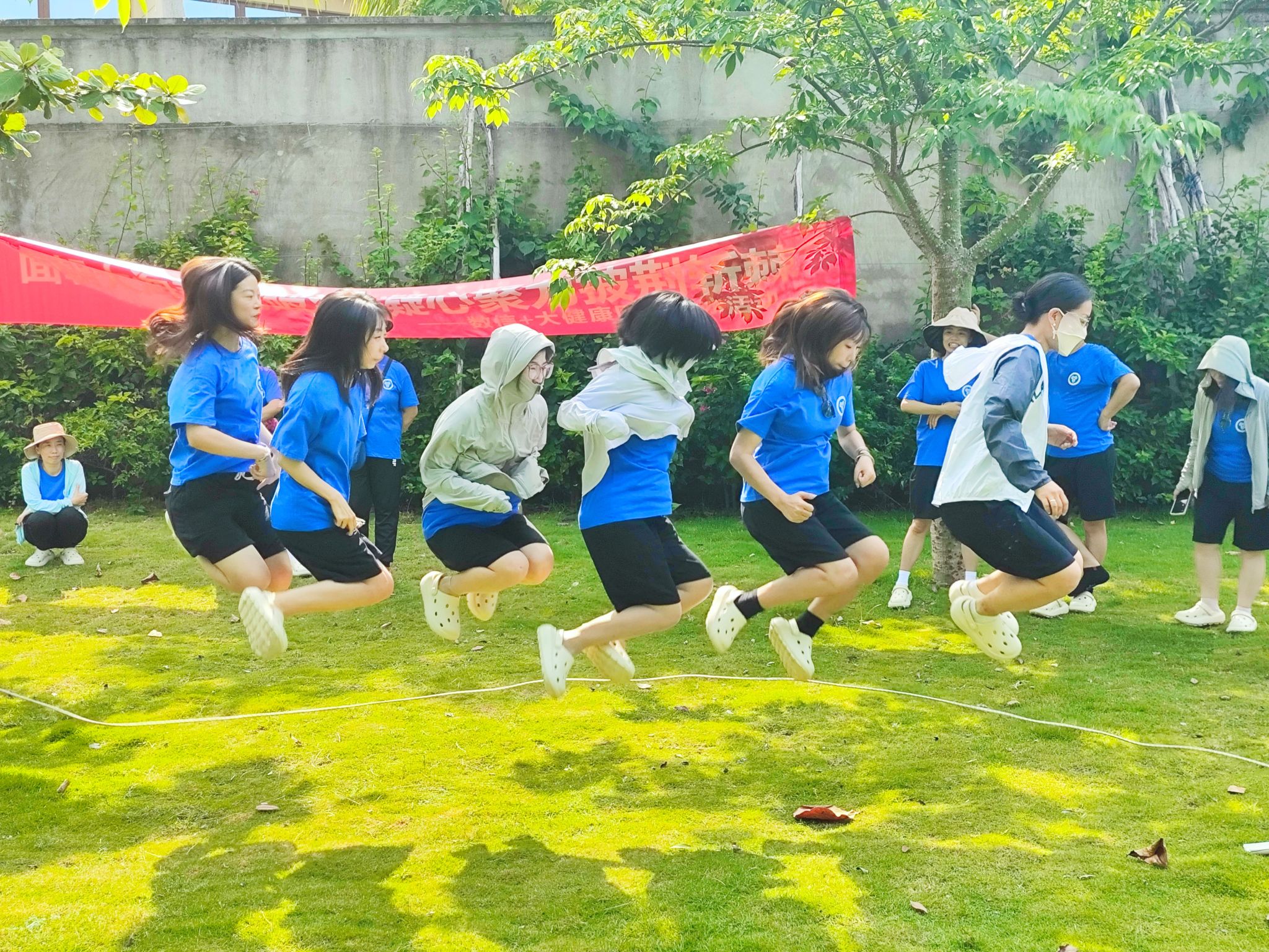 接下来的“跳绳接力”项目更是让大家体会到了团队合作的重要性。每组成员依次跳过长绳,速度与配合是取胜的关键。教师们在比赛中展现了极高的默契度和团队精神,现场气氛热烈而欢快。