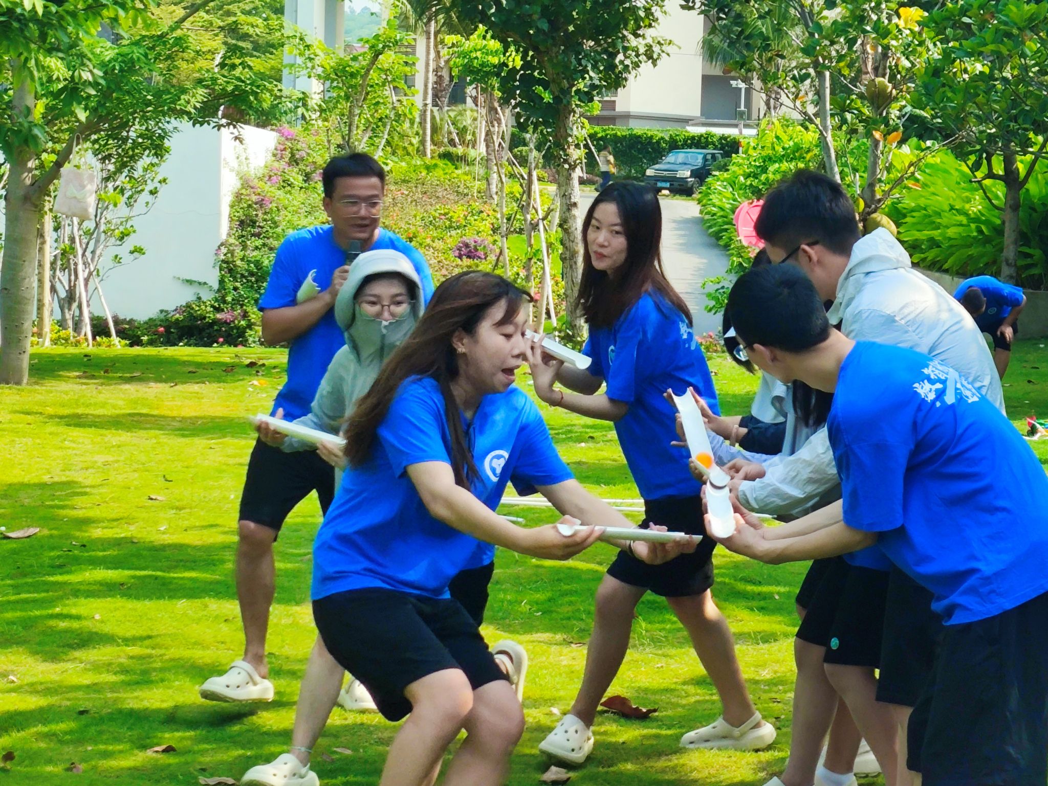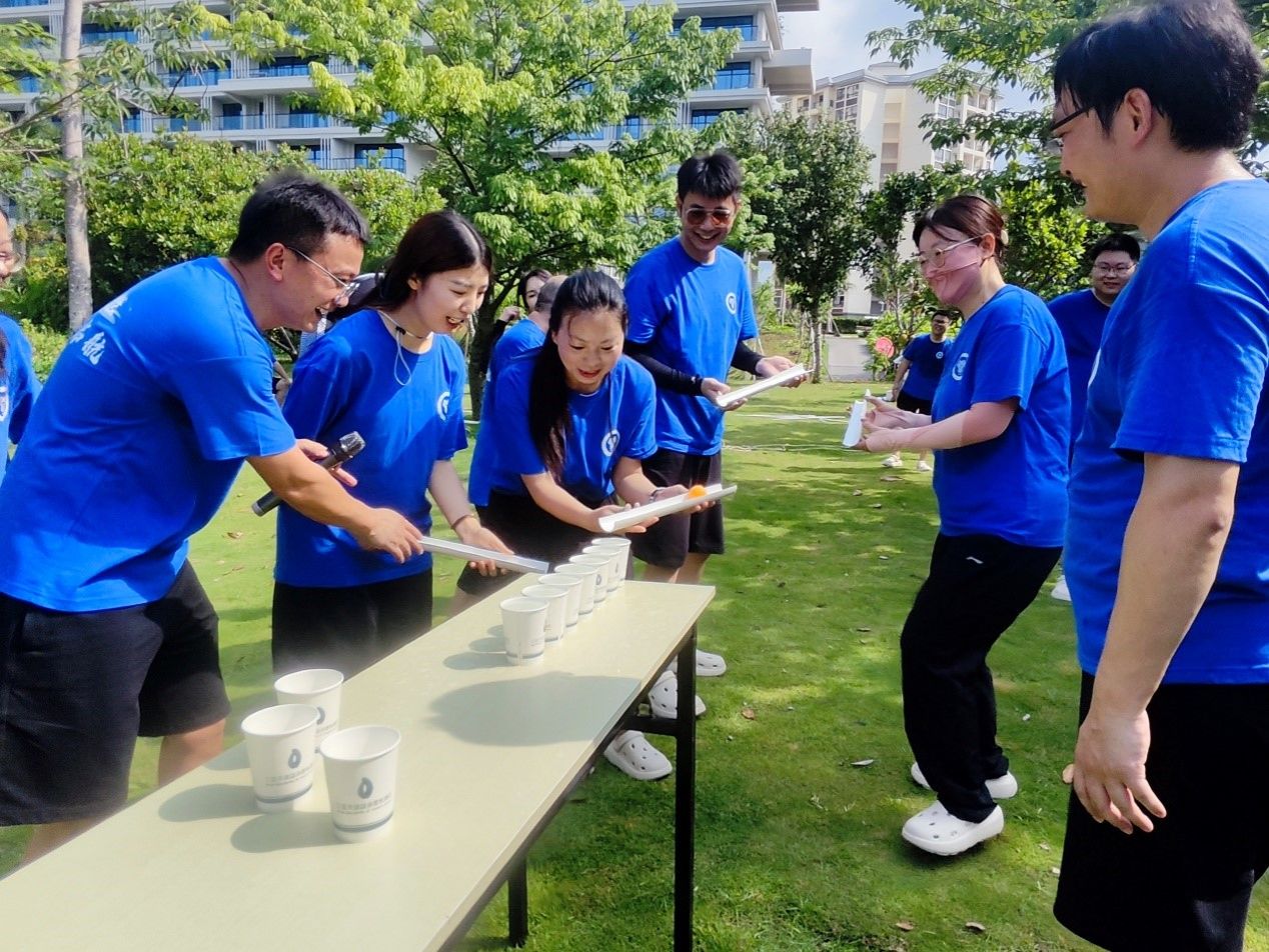 在“纸杯传递水(龙珠戏水)”环节,大家通过传递装满水的纸杯,将水从起点传递到终点。这个项目不仅锻炼了大家的协调能力,还考验了每个成员的耐心和细致。