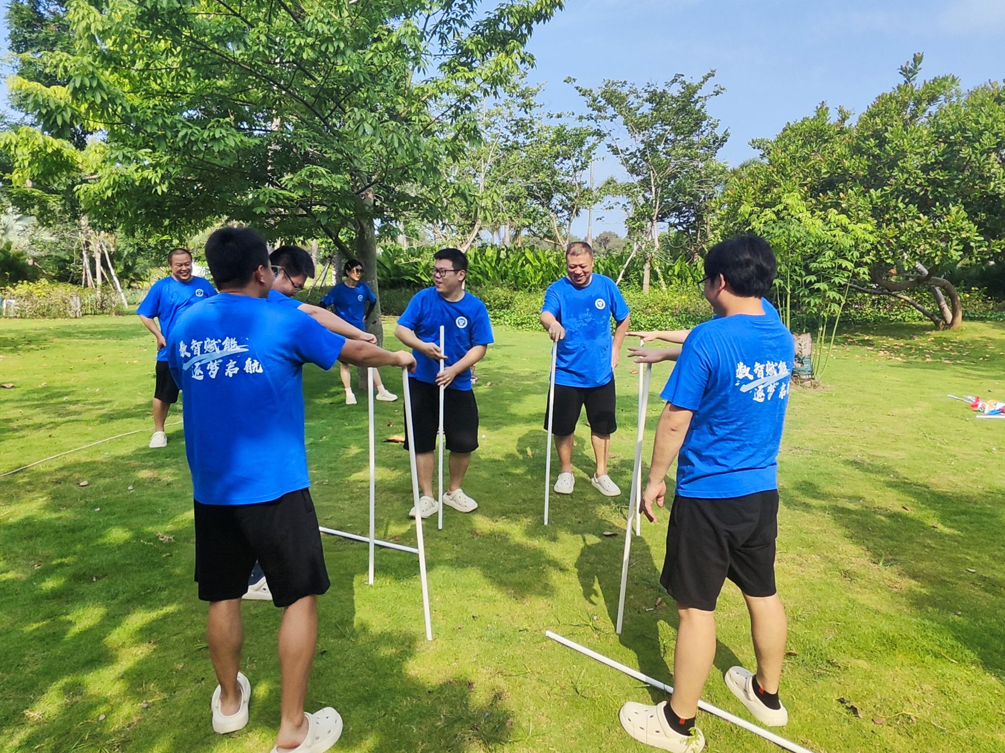 “激情传递”项目则通过一个接一个的传递动作,将团队的激情和能量传递给每一个成员,增强了大家的团队凝聚力。最后一个项目“不倒森林”,通过协作使每个成员在彼此支持下保持平衡,不倒下。这个项目进一步加强了团队的合作精神和协调能力。