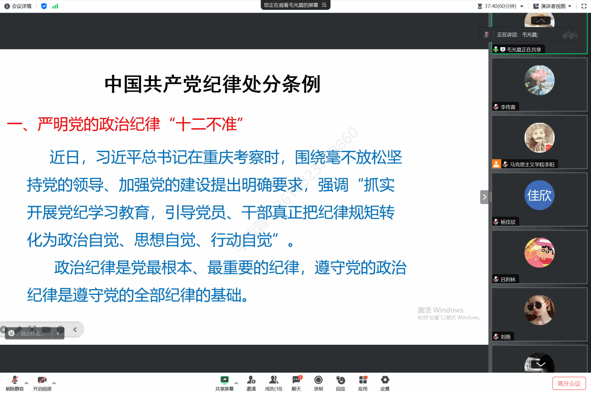 为贯彻落实中共重庆移通学院委员会印发的《全校开展党纪学习教育实施方案》移通委〔2024〕15 号文件精神,强化对党规党纪学习,进一步增强教师的纪律意识,确保党的纪律严明、规矩严明,5月15日下午2时,马克思主义学院党支部中国近现代史纲要教研室党小组全体党员相约腾讯课堂,学习了《中国共产党纪律处分条例》全文,此次学习由毛光晨老师主持。