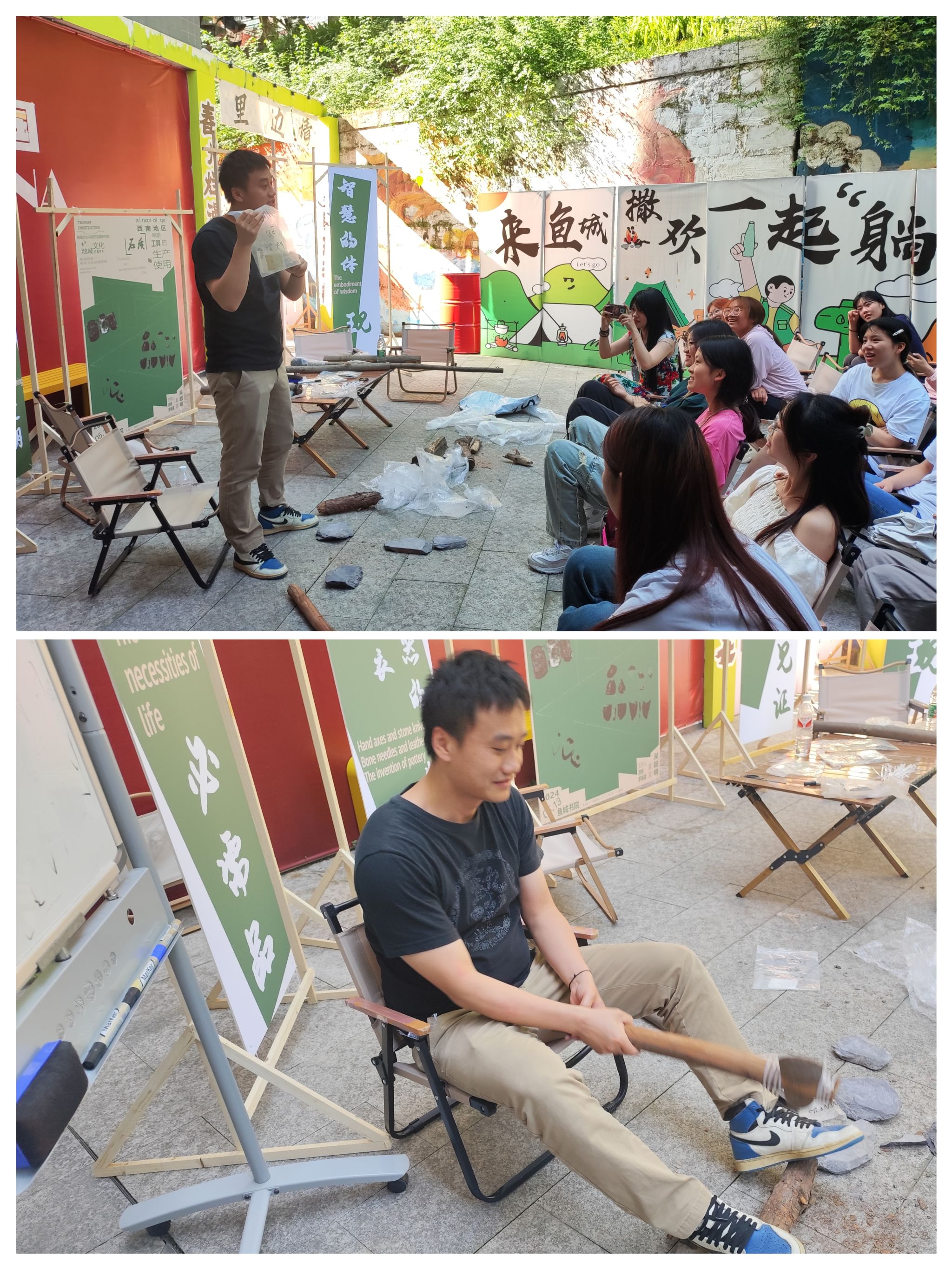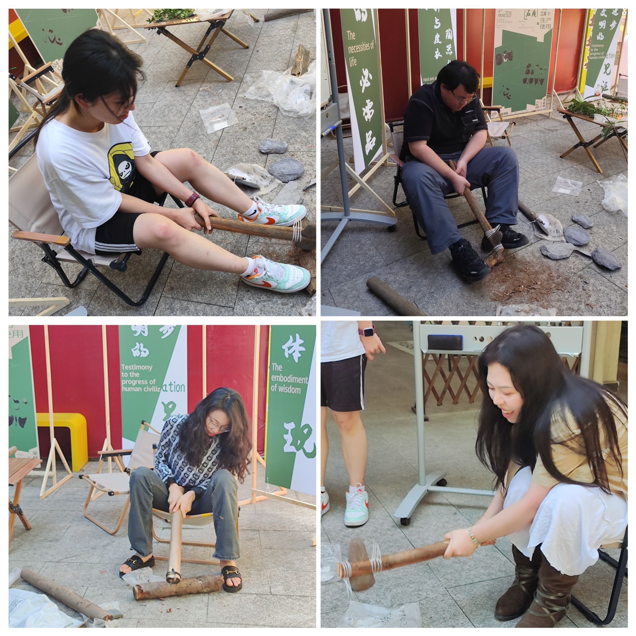 讲座进入实践环节后,吴老师亲自示范了如何选择台面和剥片面以及它们之间的夹角范围。他精湛的技艺和细致入微的讲解让在场的同学们赞叹不已。随后,同学们有序上台进行实践操作。在操作过程中,吴老师耐心地为同学们纠正动作,并鼓励他们互相讨论、交流心得。整个实践环节充满了浓厚的学习氛围和热烈的讨论声。