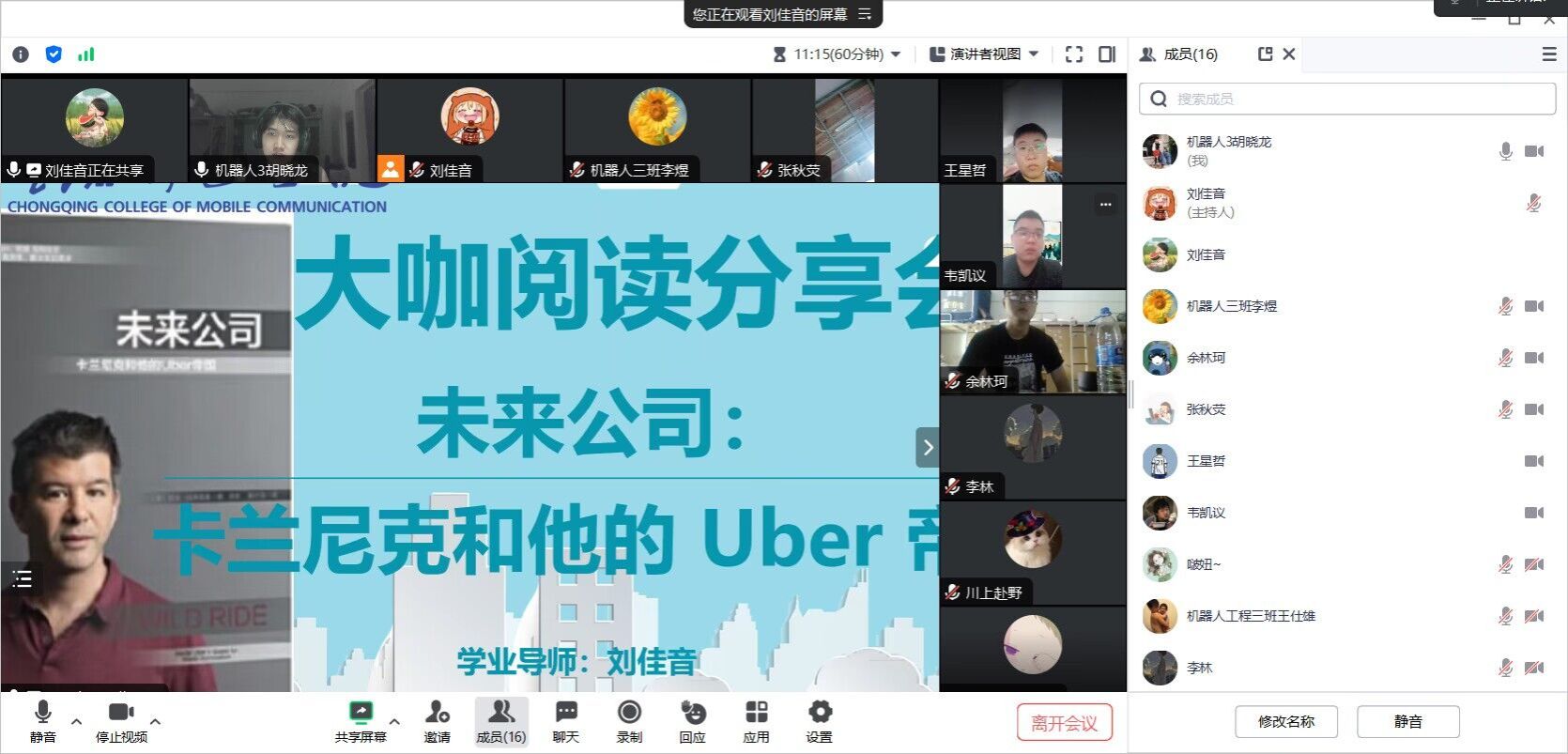 自动化教研室刘佳音老师于2023年以腾讯会议为线上平台,开展了《未来公司:卡兰尼克和他的Uber帝国》为讨论主题的大咖阅读讨论会。本次讨论的材料来自图书馆第22期的推荐阅读,书的内容以独角兽公司为核心展开了Uber帝国的兴起。说到Uber,很多中国人的印象,可能还是它在中国市场和滴滴火拼,最终以失败而逐渐退出中国这件事。但其实,Uber才是网约车的鼻祖。11年前,Uber横空出世,首次创造了网约车这个新模式。刘老师指出,在当前的社会现状下,共享经济的发展中其实也出现了不少问题,就比如Uber在最兴盛时期的下坡路,但是以共享经济为前提,坚持促进发展和监管规范两手抓、两手都要硬,在发展中规范、在规范中发展,这些问题都是可以改善的。比如未来共享经济平台建立全链条全领域监管体系、强化监管执法和构建多方参与的数字经济治理体系,促进共享经济可持续、高质量发展,更好地发挥共享经济在促进经济转型发展、激发消费市场潜力、促进和稳定社会就业等方面的潜在动能。