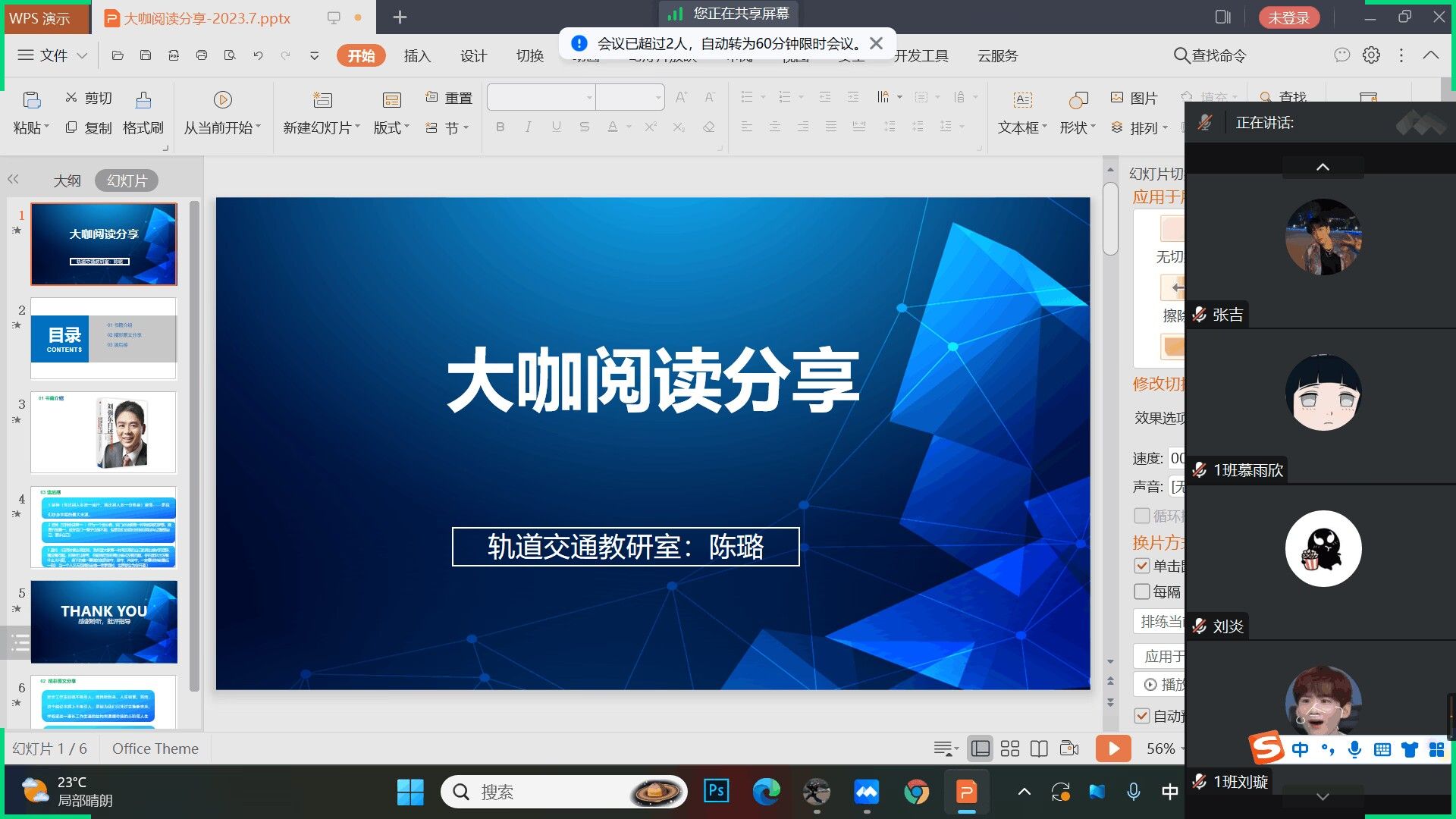 8月26日通过腾讯会议,由轨道交通教研室老师陈璐,组织2022级轨道交通信号与控制专升本1班的学生,开展了大咖阅读计划分享会。本次分享的书籍是《刘强东自述:我的经营模式》,这本书深入地阐述了京东的经营理念,全书讲述京东从一个中关村的小柜台,成为中国营收模式最大的互联网企业,全书共分为六个部分,刘强东毫无保留地分享了关于企业管理、团队建设、产品管控等多方面的实践和思考,全面展现了京东的成功之道。另外,此书有一个可以称道的地方,写作口语化,以数据与事实说话,并没有长篇的繁文缚节,相对来说较为接地气。