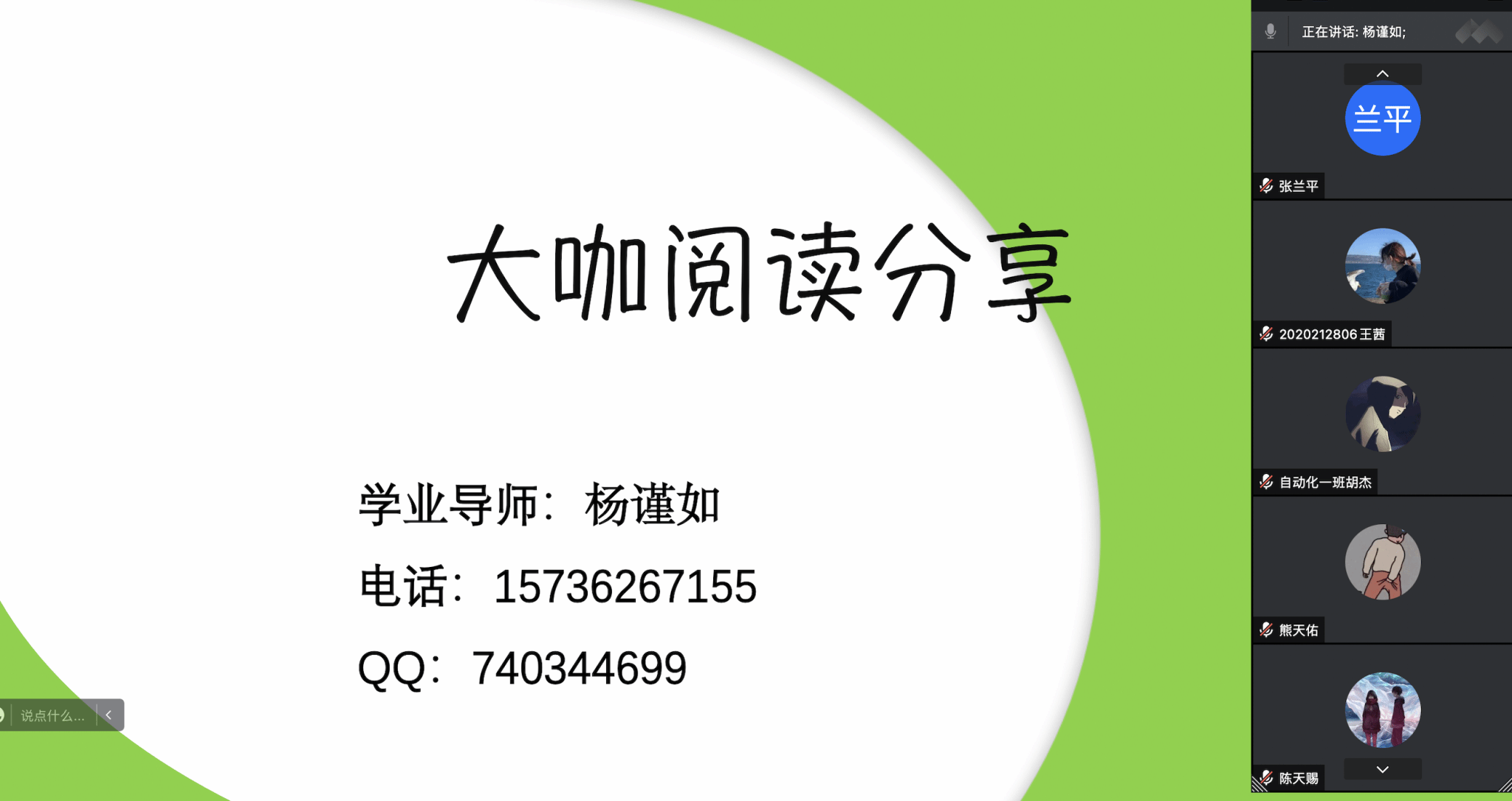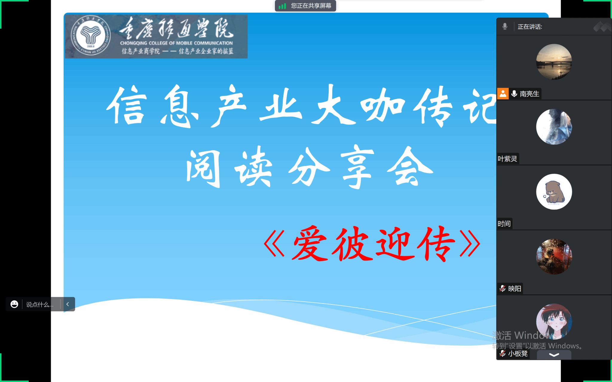 7月28日,自动化教研室杨谨如老师带领2020级自动化1班全体同学在线上开展信息产业大咖传记阅读计划分享会。本次分享会主要分为两个部分,首先杨老师与全班同学分享了《爱彼迎传》书籍中的一些例子。告诉同学们光鲜亮丽的成功背后必有千辛万苦的付出,成功大部分都是从平凡的工作做起,年轻人千万不可以眼高手低。这些能力在企业家身上都是非常重要的品质。随后同学们也分享了在假期阅读《爱彼迎传》过程中自己所受到启发的段落和章节。通过此次分享活动,提升同学们对信息产业的了解,让同学们从阅读中享受读书的乐趣,培养和激发学生创新思维。