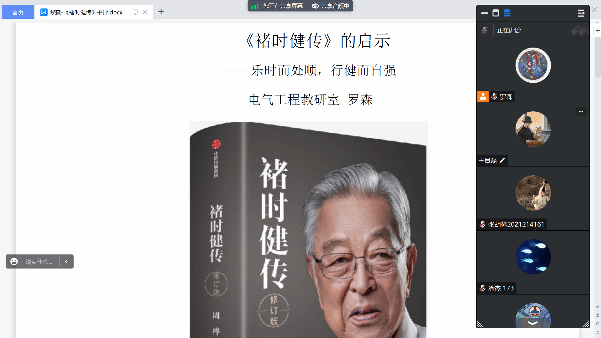 电气工程教研室罗森老师通过线上会议的方式,开展本次阅读活动。本次学业指导围绕所带班级所选的《褚时健传》展开,褚时健先生的人生几经起落,他丰富、起伏的人生经历,他的命运和我们国家的政治经济体制过招不断,碰撞不断;他的个人故事紧贴着共和国一个甲子的时代变迁。他的生活里有着生离死别,荣辱变换,人生经历当得上“传奇”二字。