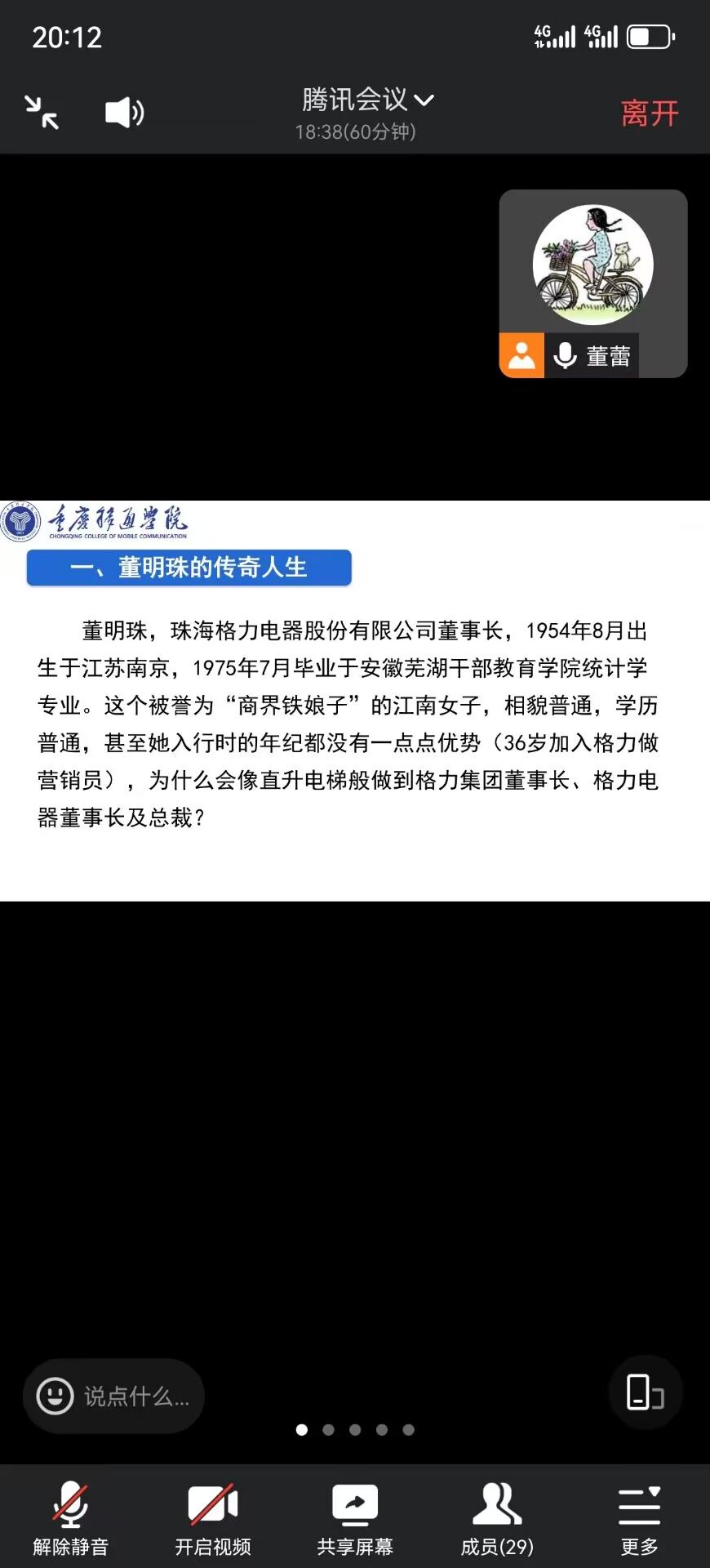 8月30日,电气工程教研室董蕾老师在腾讯会议上举行了大咖阅读分享会,董蕾老师带领2021级电气工程及其自动化6班的同学一起分享交流《董明珠与格力空调》这本书。董老师讲到,《董明珠与格力空调》这本书说的是董明珠带领格力电器从一家小厂发展成为了全球知名的电器制造商之一的故事。其中可以学到很多宝贵的经验和智慧。同学们踊跃发表自己的感悟,应该向董明珠学习,做一个坚持创新,敢于挑战,坚守信念的人。不断开拓全球化视野,与国际交轨。