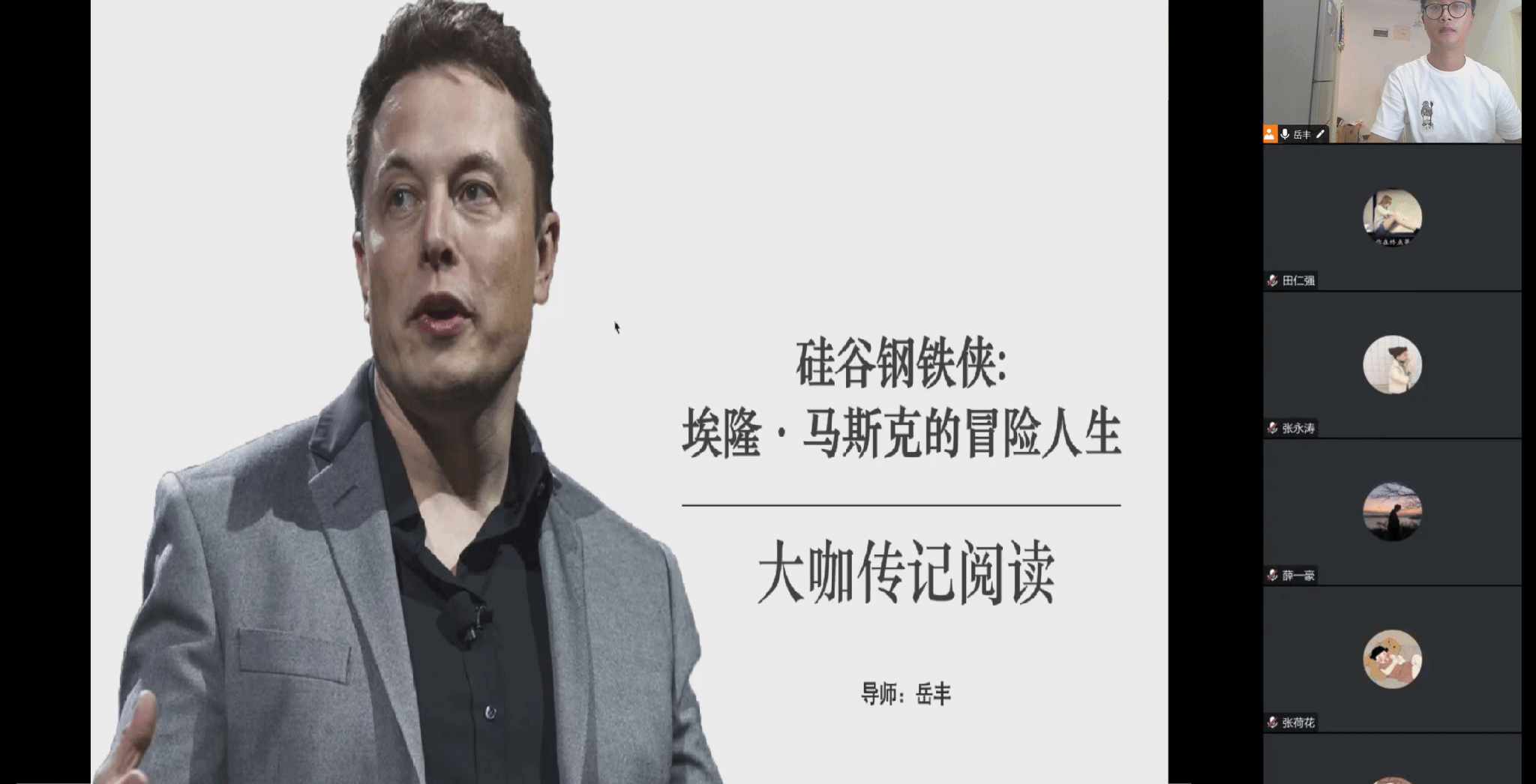 7月23日,自动化教研室岳丰老师通过腾讯会议的方式,举办了一场别开生面的大咖阅读分享会。参加班级包括2021级自动化类4班和2022级自动化类4班,大家一起分享了《硅谷钢铁侠:埃隆·马斯克的冒险人生》这本书。