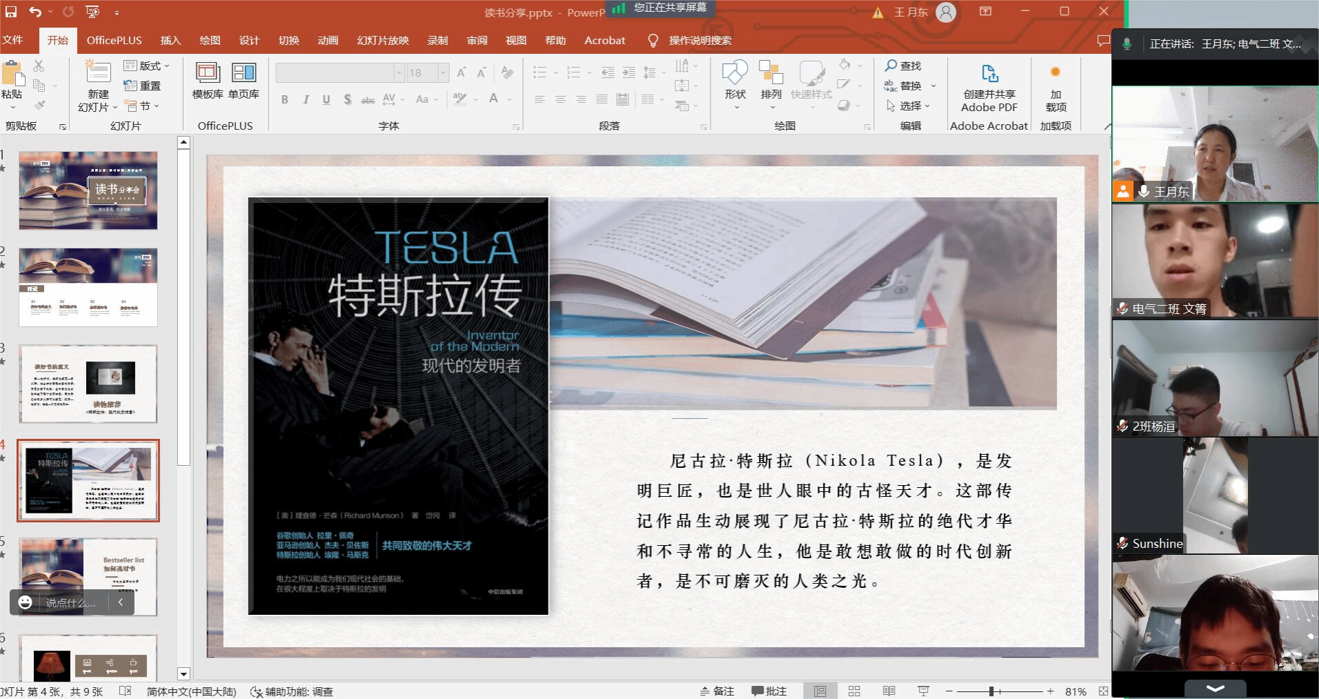 8月20日,电气工程教研室王月东老师邀请2022级电气工程及其自动化专升本2班的同学们开展了一次引人入胜的“暑假读书分享”线上会议。本次分享会聚焦于《特斯拉传:现代的发明者》,从人物生平和主要成就两方面深入剖析尼古拉·特斯拉这位伟大的发明家,揭示他对现代科技与社会的深远贡献。会上,热爱阅读与科技的同学们也分享了对特斯拉及其创意的见解,提出问题并与老师展开互动讨论。最后,王老师总结道,特斯拉是一位极具科学天赋和非凡创新能力的人,但即便是这样的伟人也并非完美。因此,在不断突破自我的过程中也要诚实地接纳自己的不完美。