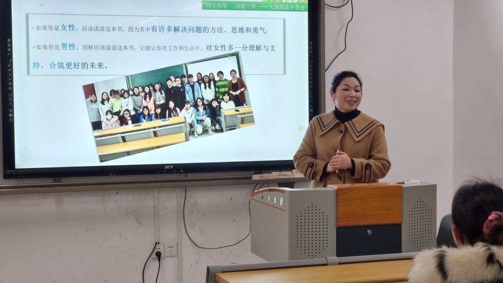 本次分享会由外国语学院副教授魏玲老师主持。她阐述了阅读大咖系列丛书的重要性和必要性,并向在场的老师分享了作为异科导师,带领学生阅读《向前一步》这本书的过程。这本书是学生票选的结果,这就能充分激发学生的兴趣;阅读过程以小组分享,学生汇报的形式进行。魏老师总结到,在带领学生阅读大咖系列丛书的过程中,应以学生的兴趣为主导,师生共读,并定期开展分享活动,分组汇报。汇报过程中,应明确各成员的任务分配和个人价值体现,分享后进行小组互评和教师点评,给予学生反馈。在整个过程中以学生为中心,教师作为引导,激发学生兴趣,充分发挥学生的能动性。