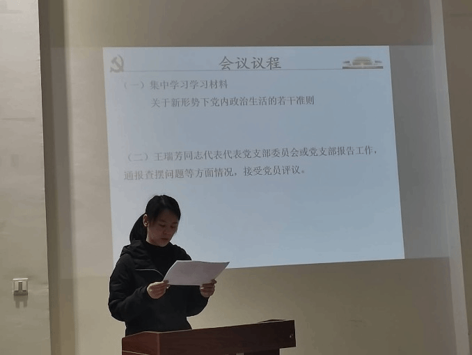 会议共5项流程,第一项议程进行集中理论学习,由上一年度支部优秀党员周平同志带领全体参会党员共同集中学习“关于新形势下党内政治生活的若干准则”。准则指出:开展严肃认真的党内政治生活,是我们党的优良传统和政治优势;新形势下要加强和规范党内政治生活,要着力增强党内政治生活的政治性、时代性、原则性、战斗性,着力增强党自我净化、自我完善、自我革新、自我提高能力,着力提高党的领导水平和执政水平、增强拒腐防变和抵御风险能力,着力维护党中央权威、保证党的团结统一、保持党的先进性和纯洁性。全体党员必须永远保持建党时中国共产党人的奋斗精神,把理想信念的坚定性体现在做好本职工作的过程中。