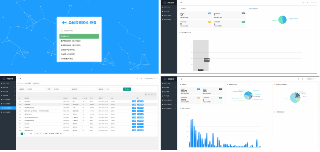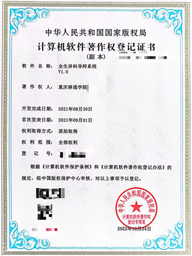 “全生异科导师系统”是双体软件精英产业学院教学团队带领学员根据集团、学校的实际需求和工作流程高度定制化研发的结果,涵盖了学生状态管理、院系管理、数据大盘、学生活动管理、成长档案评价等多个模块功能。通过这款软件,三校异科导师能够实现各项工作的在线处理、数据统计和分析,从而提高管理效率,优化资源配置。“全生异科导师系统”也是学院立足实际、产教融合的重要产出成果,为固化学院教育教学成果输出,保护集团、学校的知识产权,提高品牌影响力,“全生异科导师系统V1.0”已经提交国家版权局并成功获批计算机软件著作权登记证书。