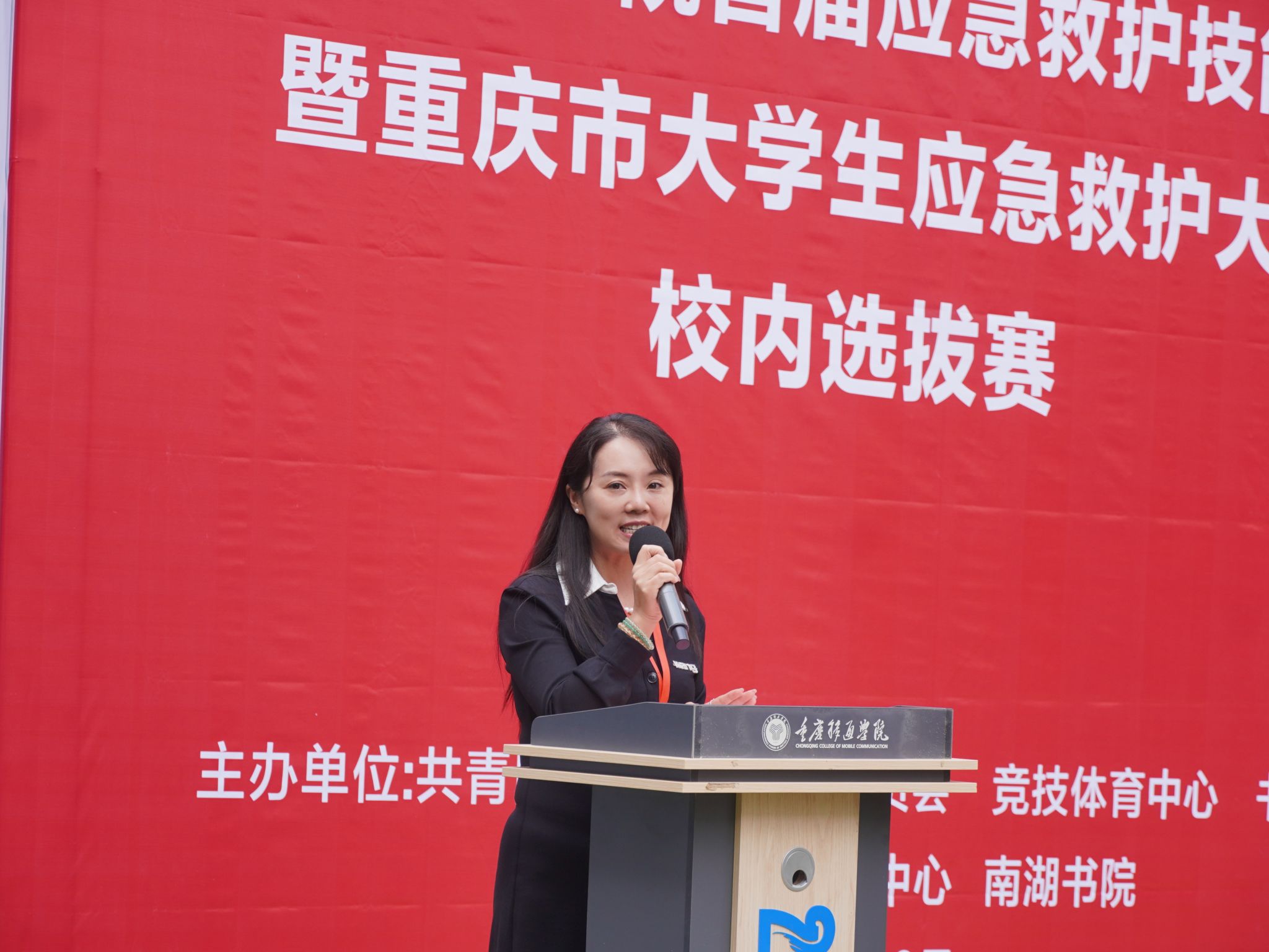 随后,合川区红十字会业务部部长张丹丹老师登台致辞。她强调了应急救护在当今社会的重要性与紧迫性,对现场参赛选手积极参与应急救护技能学习的热情给予高度赞扬,并对本次大赛寄予深厚期望。她希望选手们在比赛中充分发挥实力,赛出水平、赛出风采,为推动应急救护事业发展贡献力量。