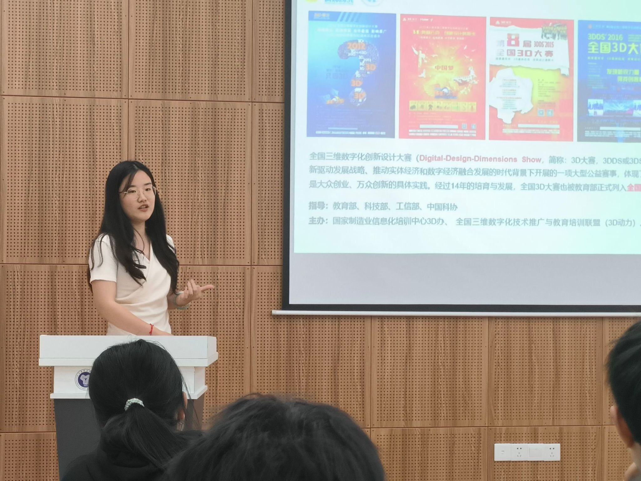 讲座开始,李甜甜同学从基础的概念讲起,详细地介绍了3D建模的基本流程和领域,简述了3D建模的独特之处和对自己的吸引力,对能够参与大赛表示兴奋和感激之情,分享了自己在创作过程中的付出和团队协作,表示了对3D建模大赛的热爱和继续探索的决心。