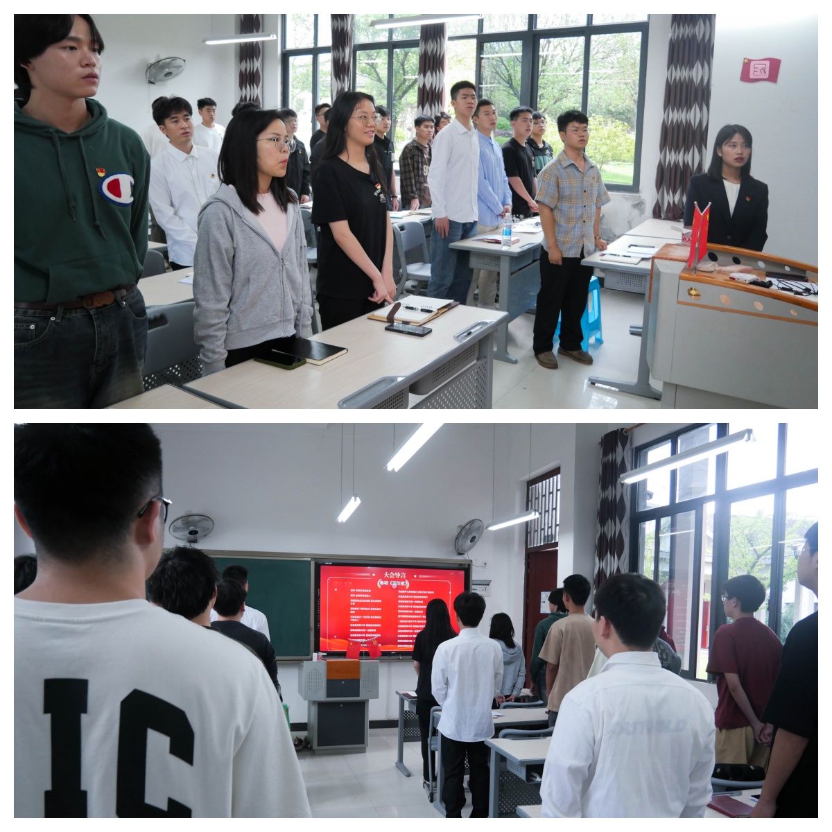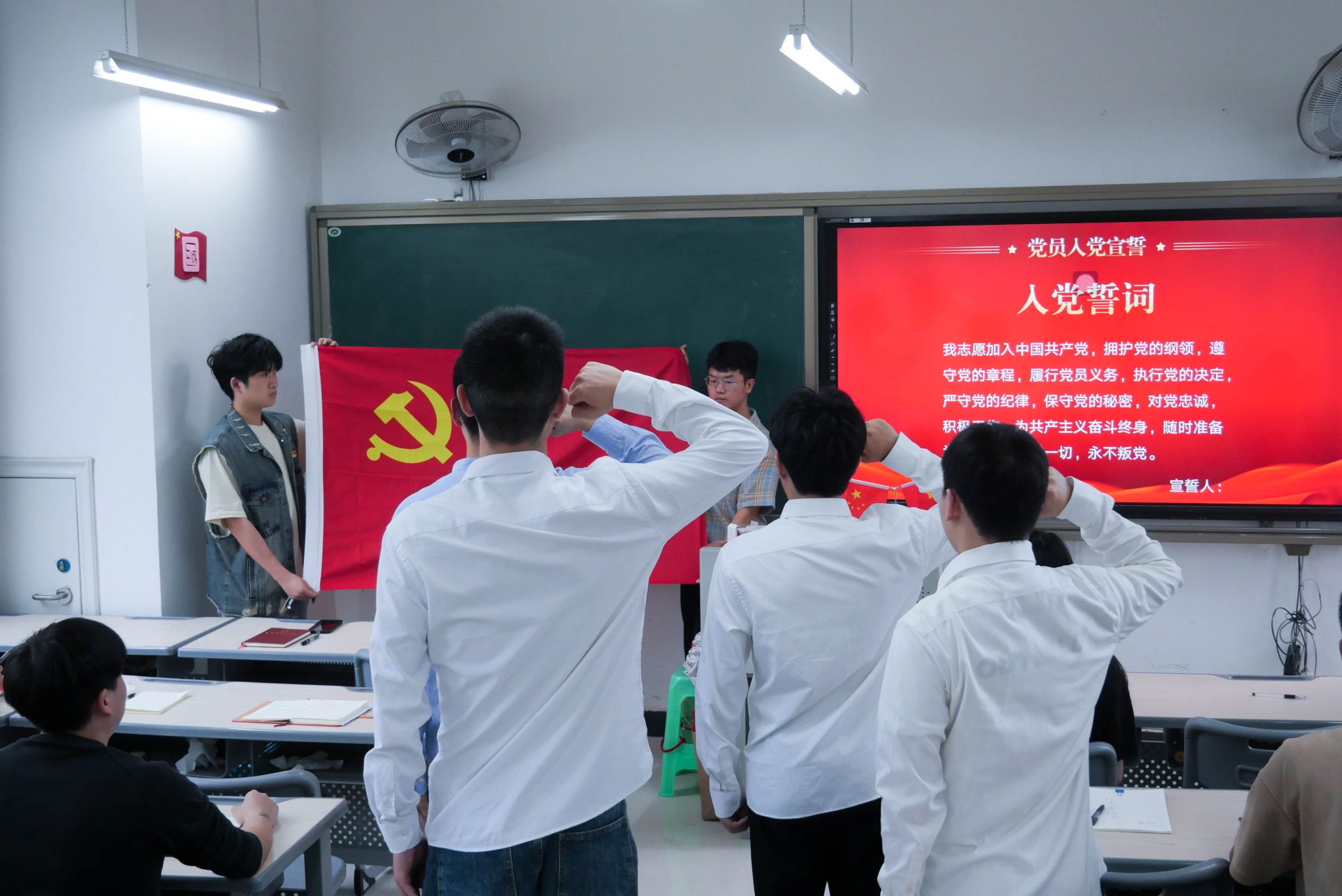 面向鲜红的党旗,荣跃同志作为领誓人,带领党员同志一起重温入党誓词。铮铮誓言,字字千钧,希望青年党员践行入党誓词,争当表率,为共产党这个光荣称号添光彩,共同促进智能工程学院党支部更好的发展。
