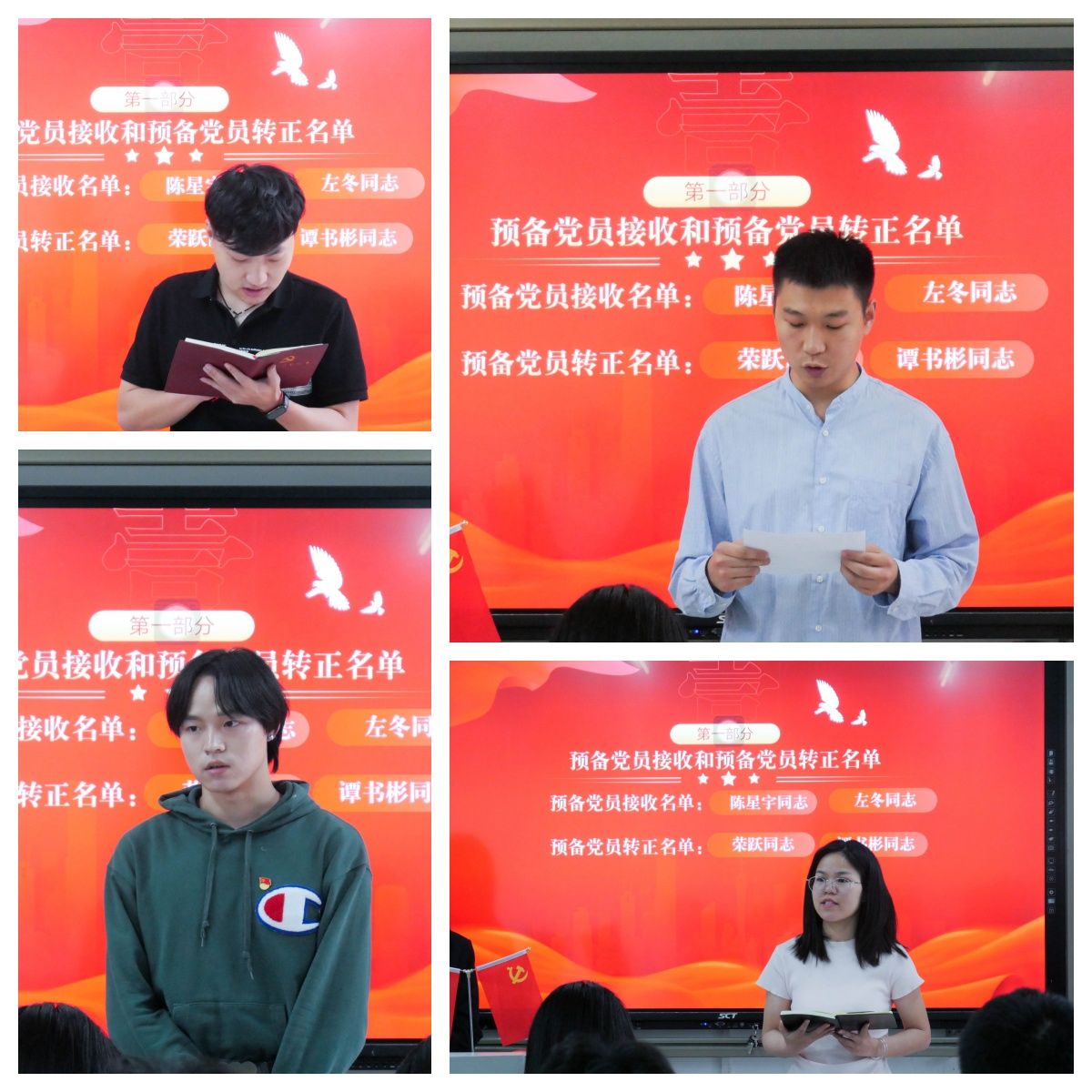 通过发展对象向支部做出本人情况介绍的发言、入党介绍人发言、与会党员发表意见等流程,具有表决权的党员同志对发展对象左冬和陈星宇2名同志是否可以接收为中共预备党员进行了表决。大会最终全票通过了接收左冬和陈星宇共2名同志为中共预备党员的决议。