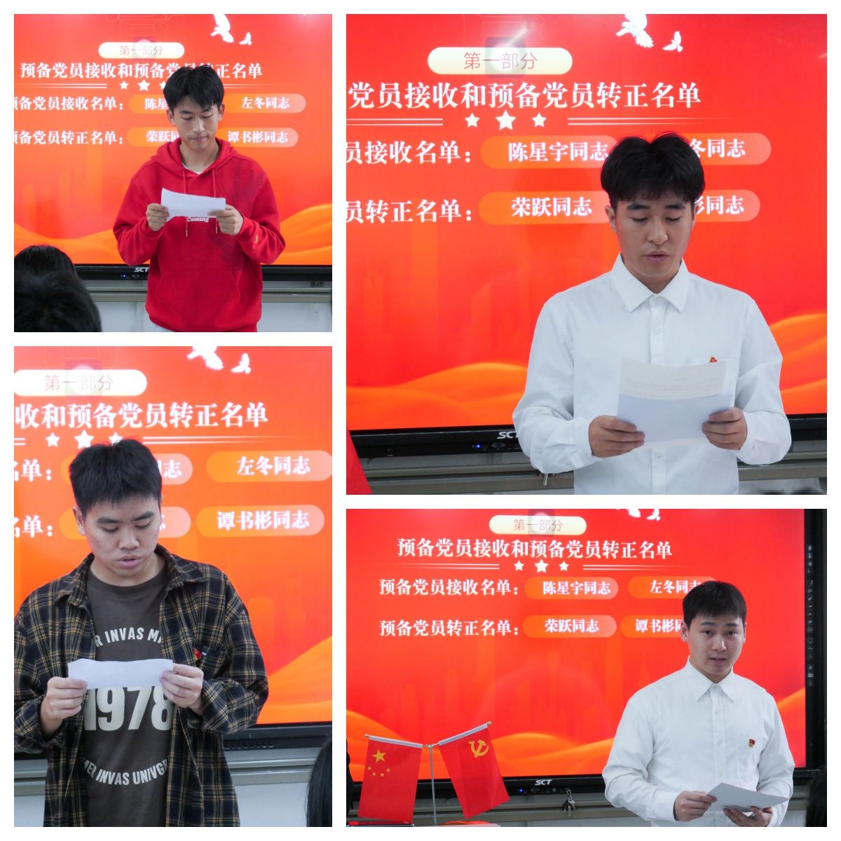 按照党员转正程序,谭书彬,荣跃共2名预备党员同志,向党组织汇报了自己在预备期内的情况,明确了入党动机并表达了自己对加入中国共产党的坚定决心。经入党介绍人介绍转正对象的主要情况以及与会党员发表意见,对其能否转正表明自己的意见。