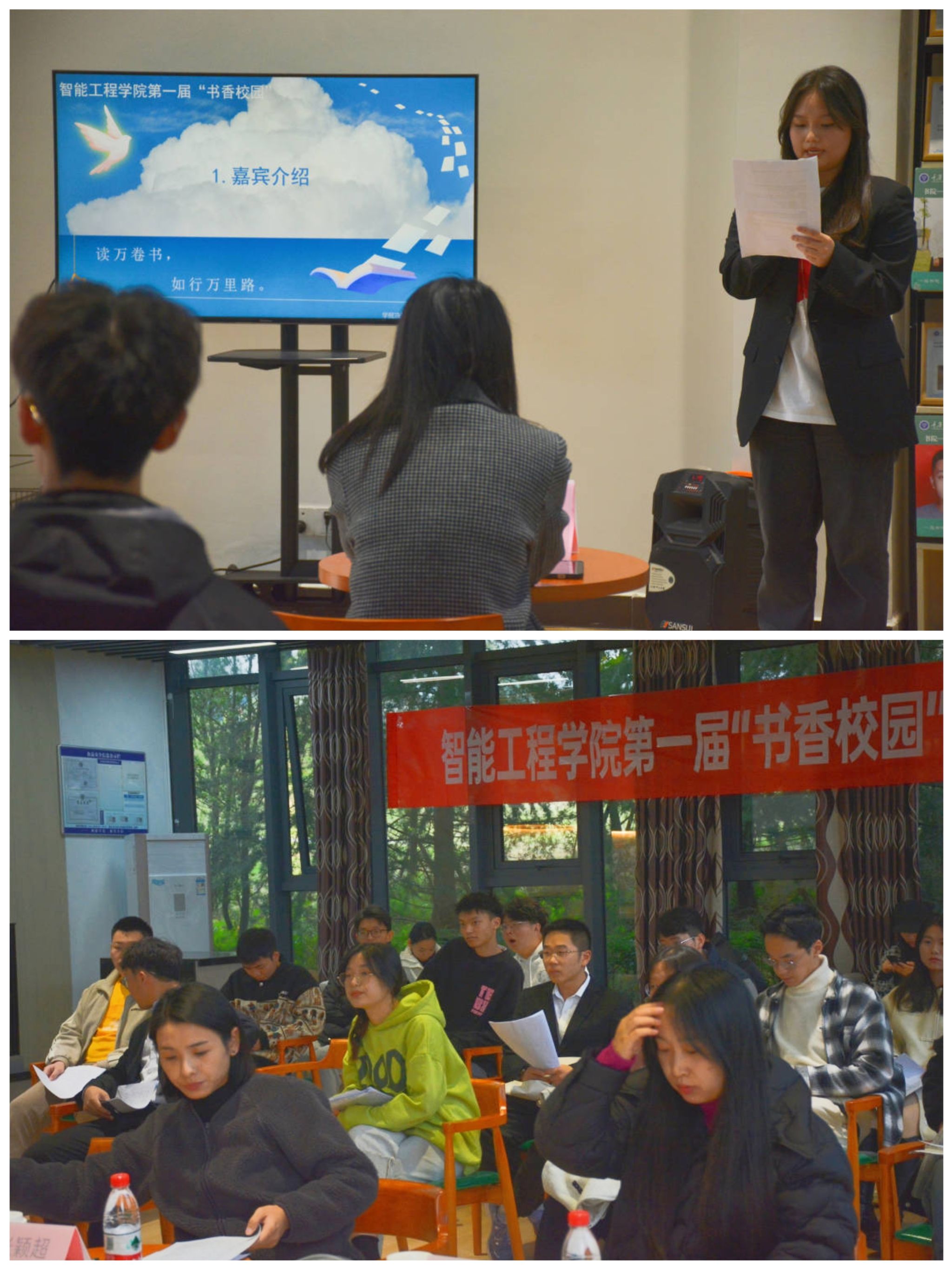 初冬已至,再见一年书香乘风叩门时。为了在学院内营造读好书、好读书的优良学风,鼓励同学们阅读经典,从阅读中汲取力量,智能工程学院开展“书香校园”系列活动。经过前期各班级初赛评选,推选出13名学生参与“书香之星”最终答辩,11月23日下午16:30于荷悦cover咖啡厅进行“书香之星”评选决赛,智能工程学院团总支书记张颖超老师、学工办主任刘桃老师、大咖专项负责老师何欢老师、社团板块指导老师吴家家老师参与答辩评审。