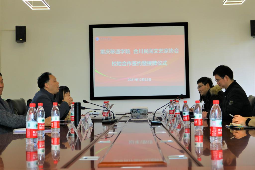 12月22日,我校与合川区民间文艺家协会共同举办校地合作签约暨“合川民间文化艺术教育实践基地”授牌仪式。仪式在移通学院梅若书院会议室举行,合川区文联副主席、合川区民协主席兰梦宁,合川区民协副主席刘进进、易宗成,合川区民协理事向庆、徐守学、陈钇伶等来校参加仪式,移通学院校长助理张衍学,地域文化与城市发展研究院位光辉院长、李凤勤老师及非遗研究会的学生代表出席活动,地域文化与城市发展研究院教师彭伟主持签约授牌仪式。