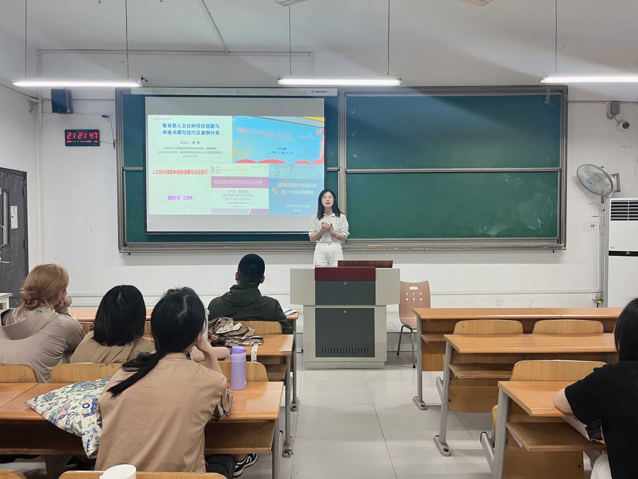 另外,在论证技巧上,靳老师总结到:要笃定一份责任感,精益求精。靳老师提到,申报书是由一系列问题所形成的,老师们要认真研读、反复理解申请书与活页上的每一条信息。在论证上要注意逻辑清晰、主题突出、层次分明、内容翔实、真实准确。同时,靳老师结合暨南大学江传月教授的讲座,详细的分享了项目申报书中研究现状、理论意义和实践意义、研究目标和内容、研究思路和方法等内容的撰写技巧及注意的问题。最后,靳老师鼓励老师们在今后的教学与科研工作中,时刻保持坚韧、钻研的精神,通过多阅读、多关注、多交流、多实践来不断提高自己的科研能力和教学水平。
