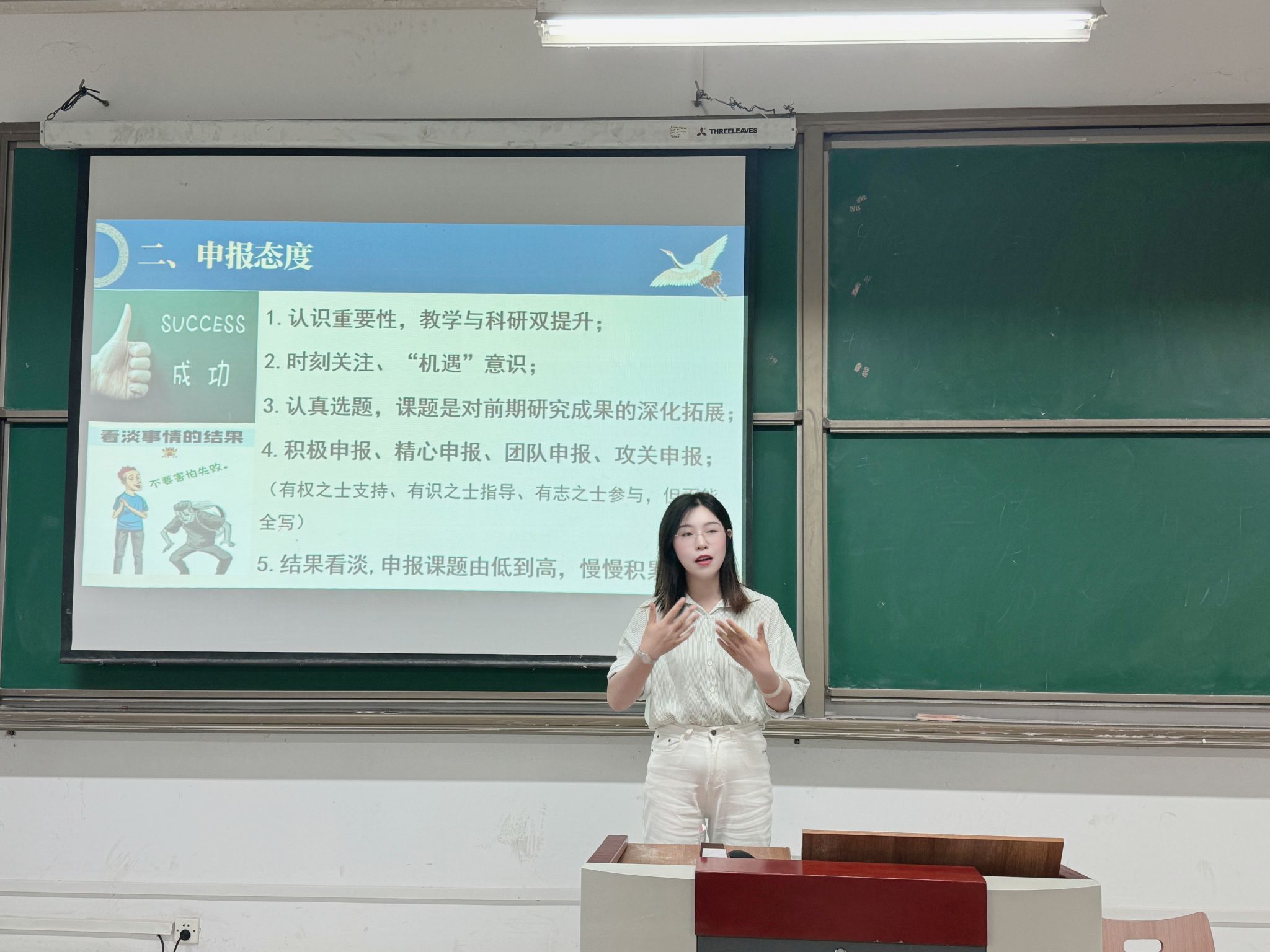 其后,靳老师以科研与教学的关系为切入点,讲到:教学是教师幸福之基, 科研则是教师幸福之源,教学与科研之间是相辅相成、相互促进的关系,用科研来反哺教学,是促进教师发展、提高教学质量的有效方法。同时,在课题研究中要积极申报、精心申报、团队申报、攻关申报,早动手、早研究、早积累。另外,课题申报有偶然性因素的存在,要做好失败的准备,保持平常心。