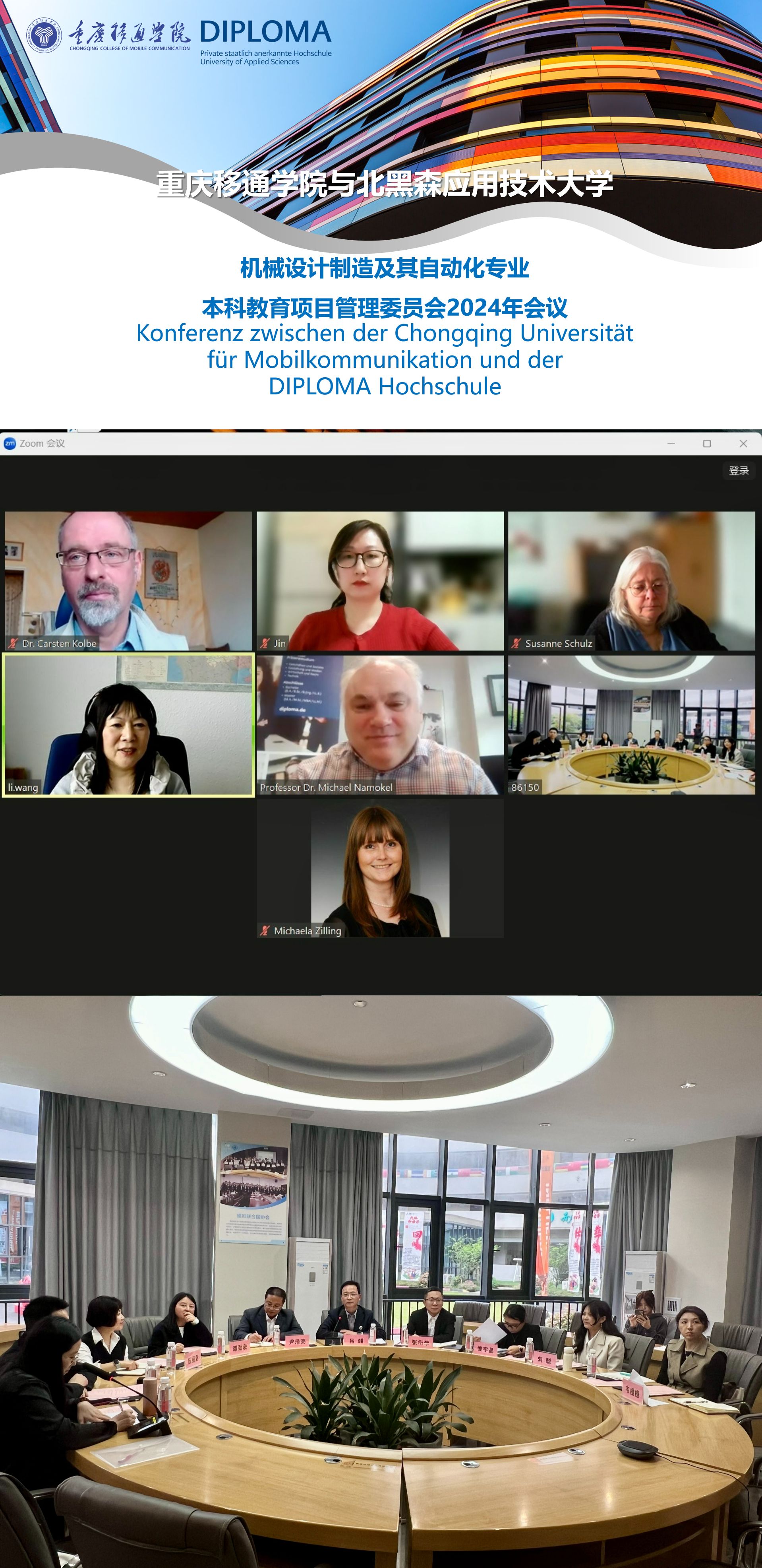 4月10日,我校与德国北黑森应用技术大学合作举办的机械设计制造及其自动化专业本科教育项目2024年项目管理委员会会议召开,会议通过线上线下相结合的方式举行。重庆移通学院校长吕翊教授、副校长张衍学、校长助理兼德国工程学院院长尹浩亮、德国北黑森应用技术大学校长Prof. Dr. Michaela Zilling、副校长Prof. Dr. Michael Namokel、国际处处长Dr. Carsten Kolbe,项目管理委员会全体委员参加会议,中德双方项目相关管理部门负责人与教学人员列席会议,会议由德国工程学院副院长侯宇晶主持。