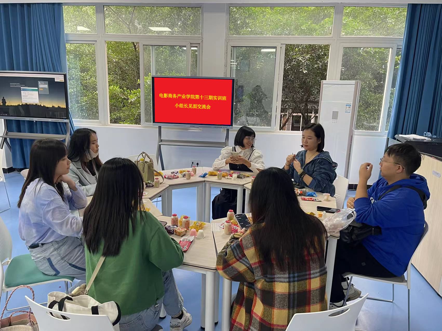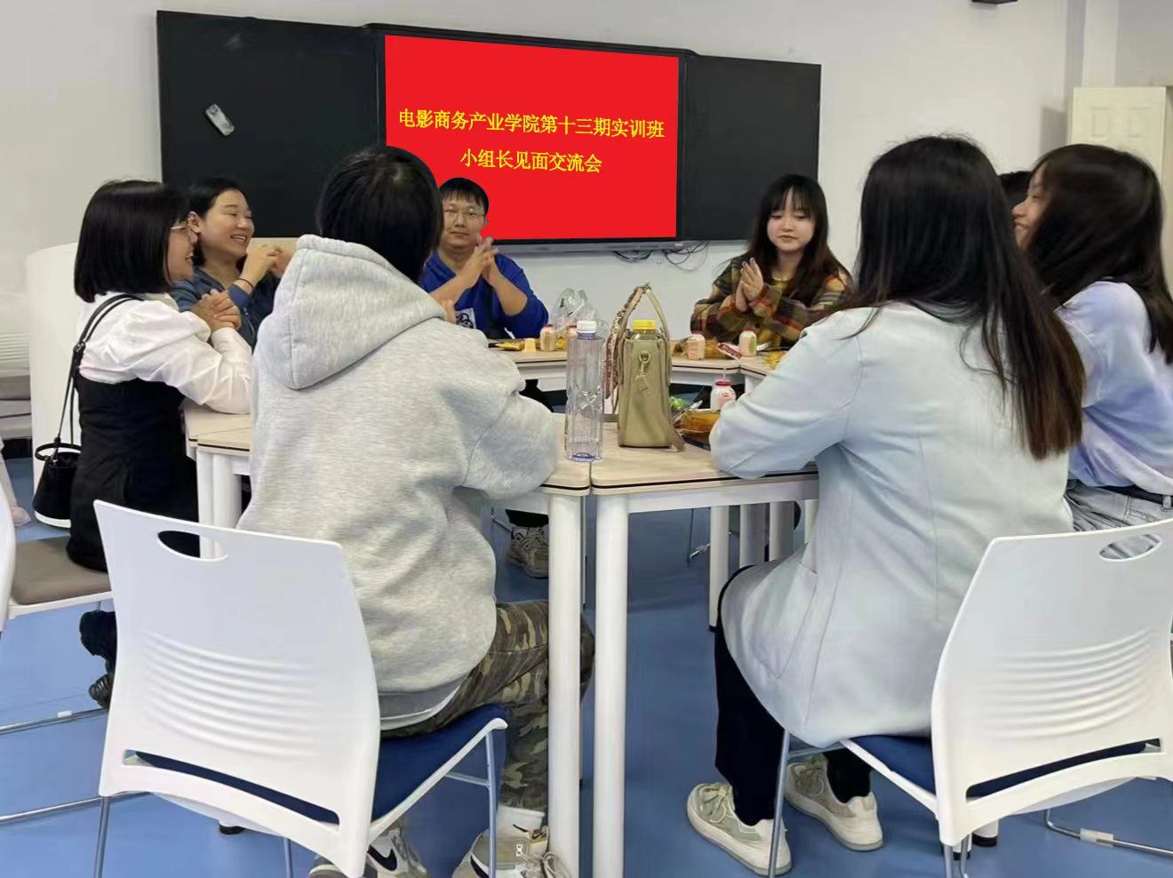 在轻松愉快的氛围中,实训班的同学们一边品尝着电影商务产业学院教师团队精心准备的零食,一边认真听着第十三期实训班班主任冉佳灵老师和晏莉老师为大家详细介绍后续在实训班将完成的学习计划和目标,以及学习过程中的经验和方法。