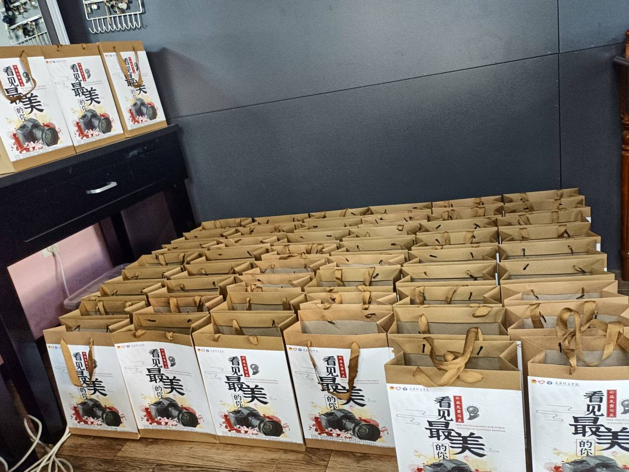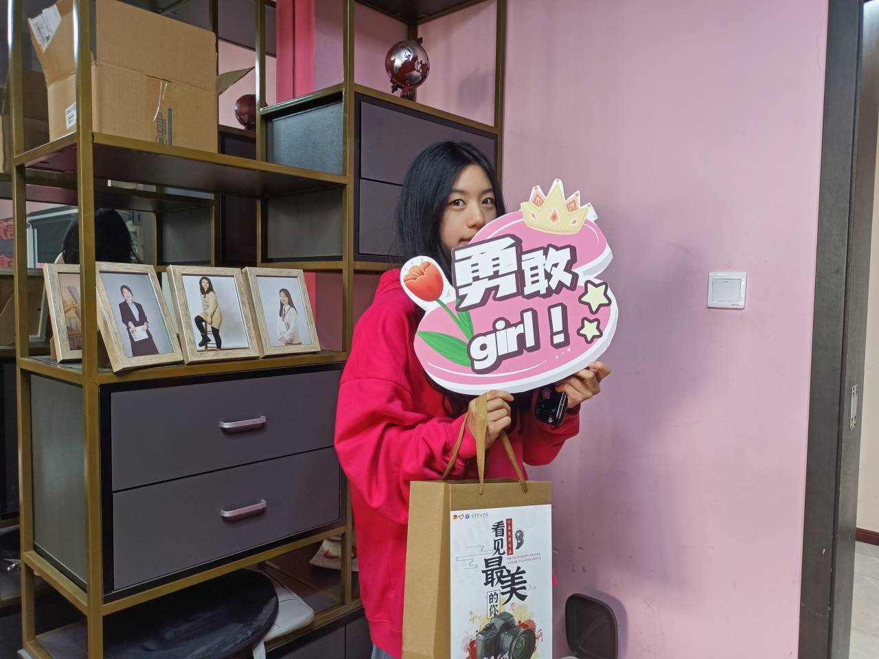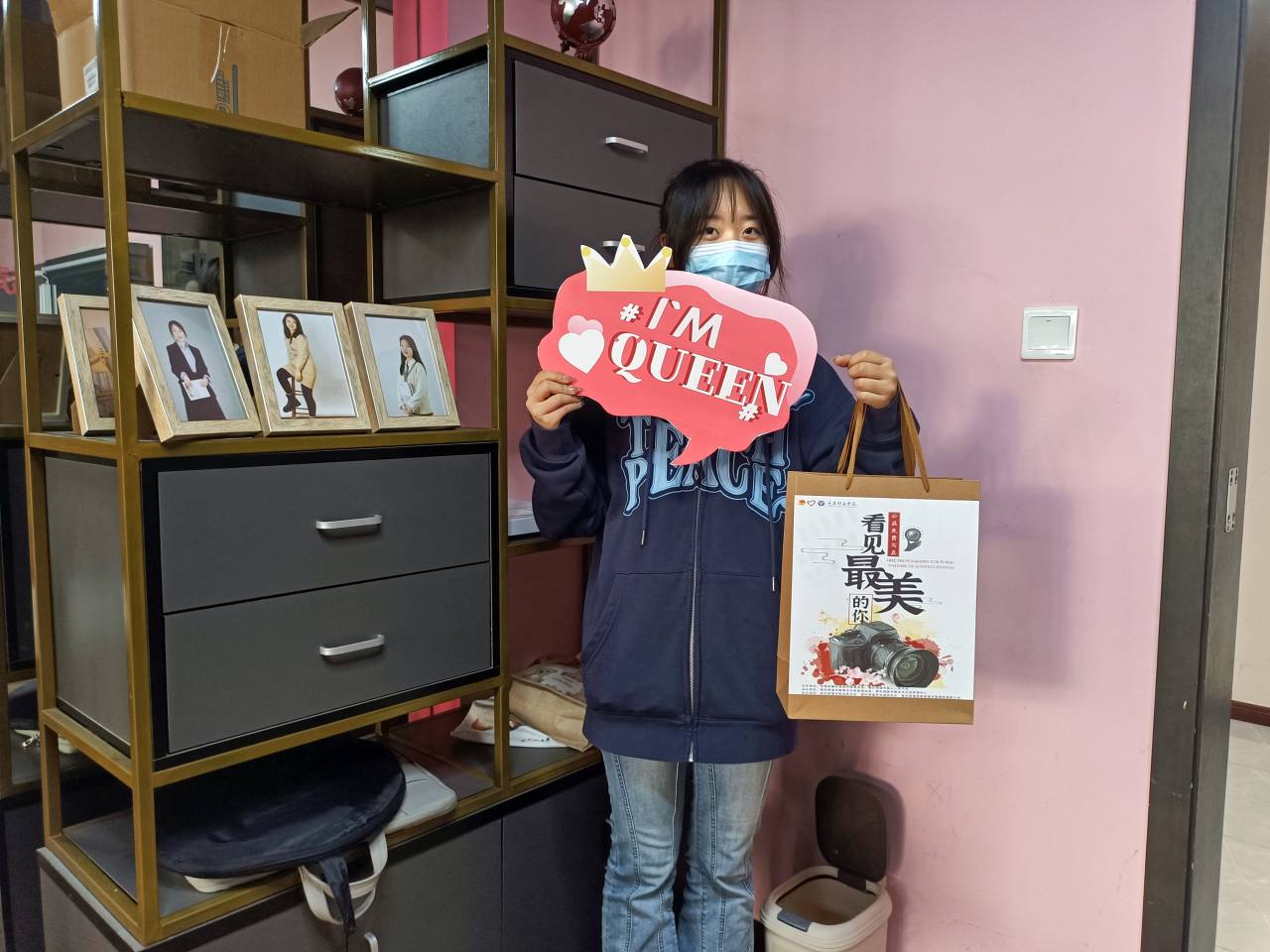 为庆祝第113个国际妇女节,我们为每一名女性教职工准备了一件特殊的礼物——定制相框+自制礼品袋,将相片打印并裱装成框,同相片、定制相框一同放入礼品袋中送于前来参与的女性教职工,并于活动背景板打卡留影,老师们对于此活动给予极大的肯定与支持。“我来之前感觉还是怀着忐忑和怀疑的心情,拍摄完毕后,拍摄过程的一些服装、妆照、成片都还是很满意。”老师们都纷纷传来赞许与感动的目光。