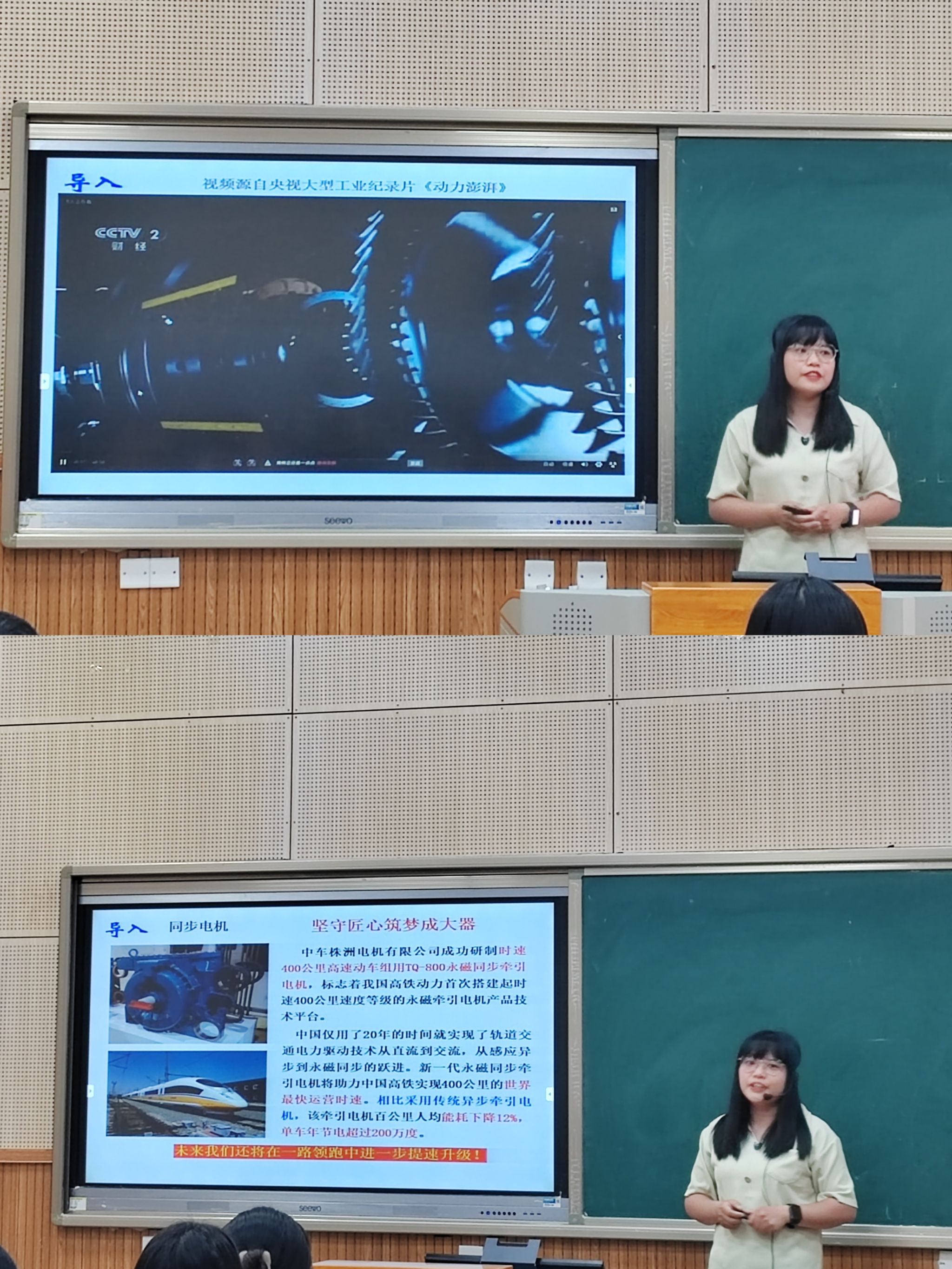 在本次示范课中,杨佳义老师首先通过央视大型工业纪录片《动力澎湃》引入案例介绍了本次公开课课程——《电机与拖动控制》,紧接着通过中车株洲电机有限公司的案例,引出坚守匠心、筑梦成大器的思政元素,从而推进示范课课程内容——同步电机工作原理。