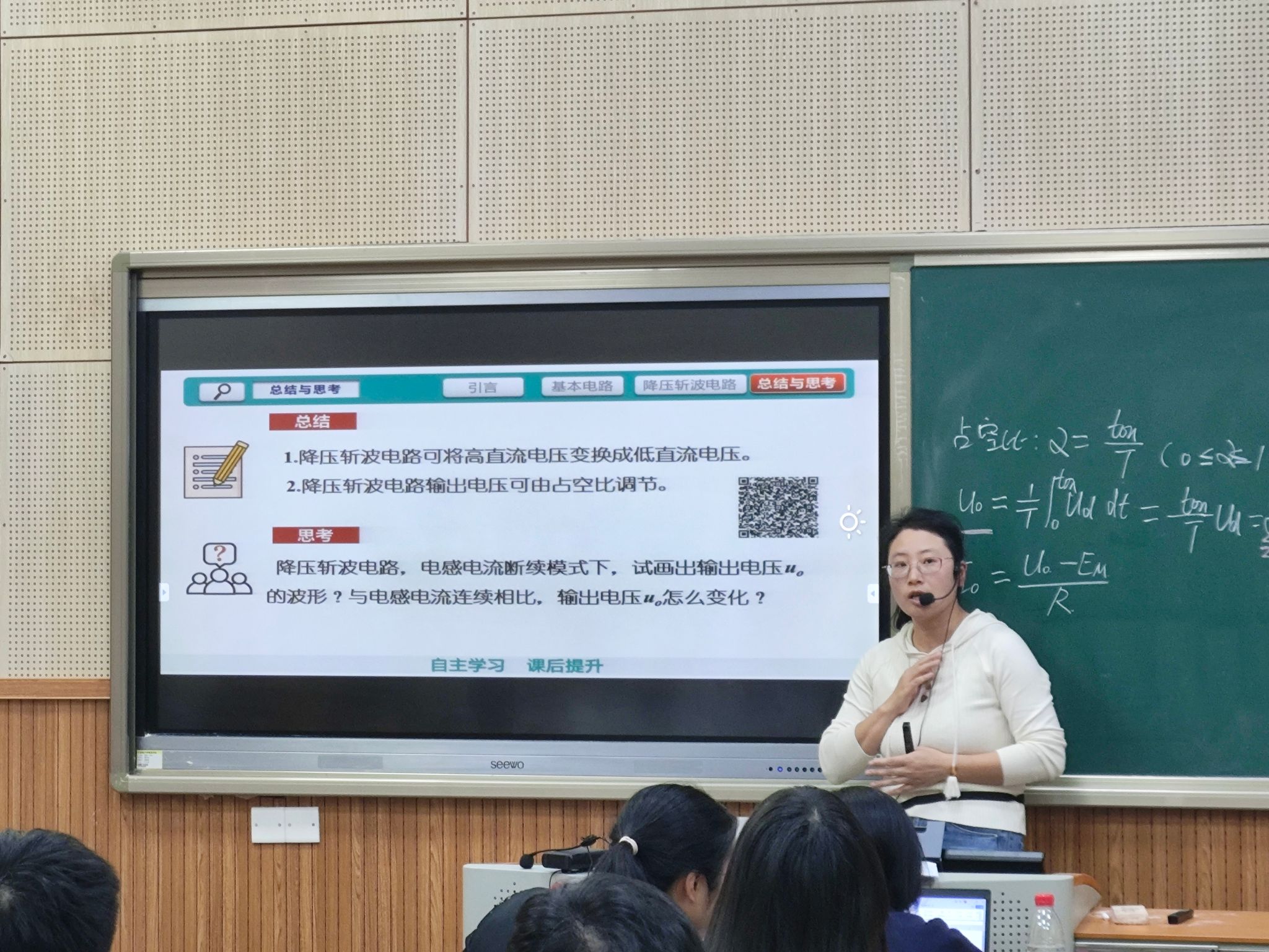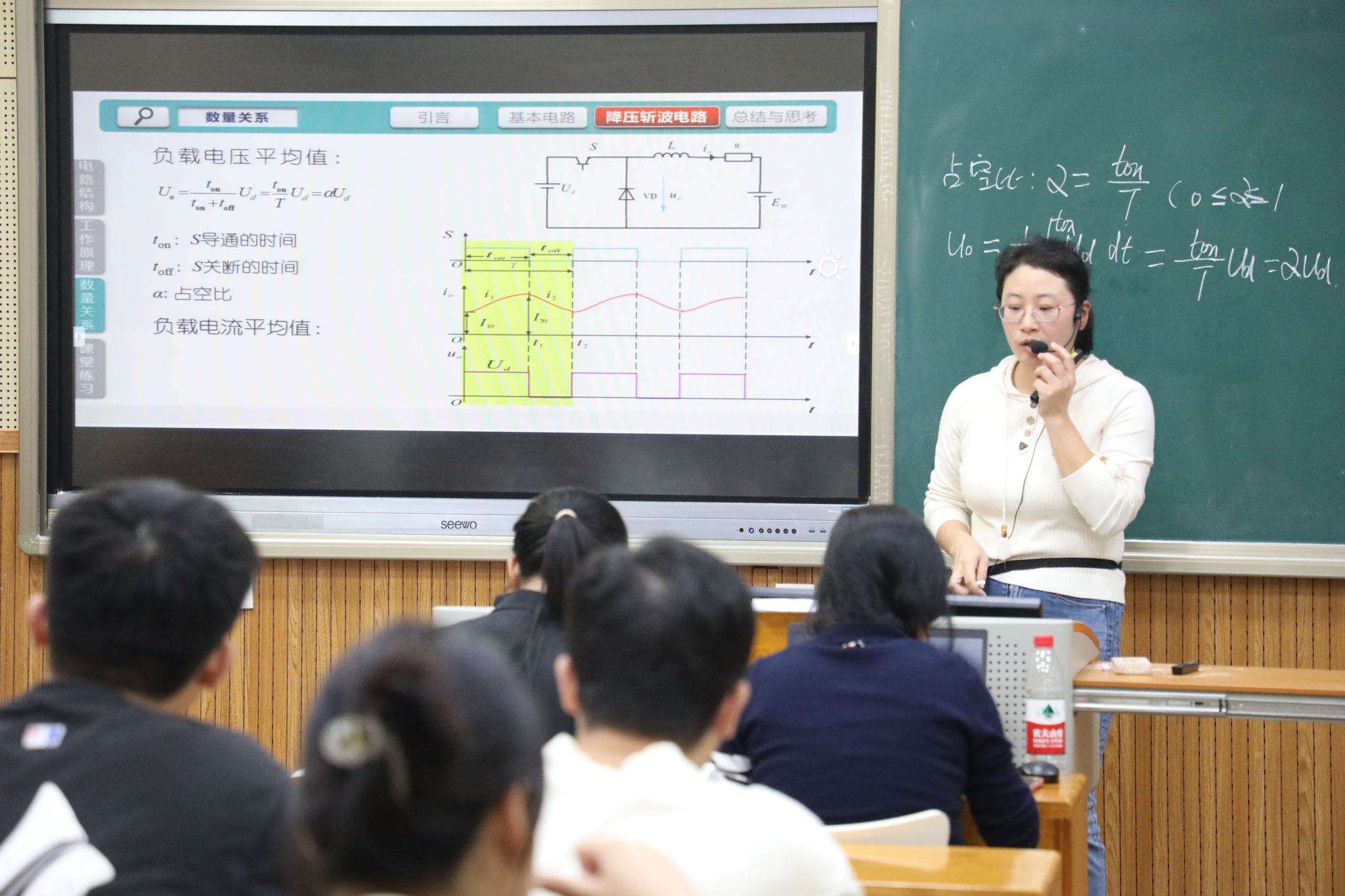 课程伊始,黄老师以常见直流电源如太阳能电路板和常用直流负载如电动车引入直流—直流变流电路内容,建立思考空间引发学习兴趣。讲解完基本模型概念后,提出纯电阻负载特点的新问题,引出斩波电路工作原理、占空比概念及计算方法等。接着阐述降压斩波电路在生活中的应用,让学生学有所思、学有所悟。最后进行课程总结,布置后续拓展材料,鼓励学生思考学科前沿问题以提高创新能力。黄老师在讲课过程中借助雨课堂开展信息化教学,讲授降压斩波电路时将理论与生活实践结合,启发学生发现身边专业知识及应用。同时,黄老师注重引导学生树立正确价值观和职业道德观,通过介绍国内电力电子技术发展实例,激发学生责任感和使命感,培养创新精神与团队合作意识,实现思政元素与专业教育有机融合。