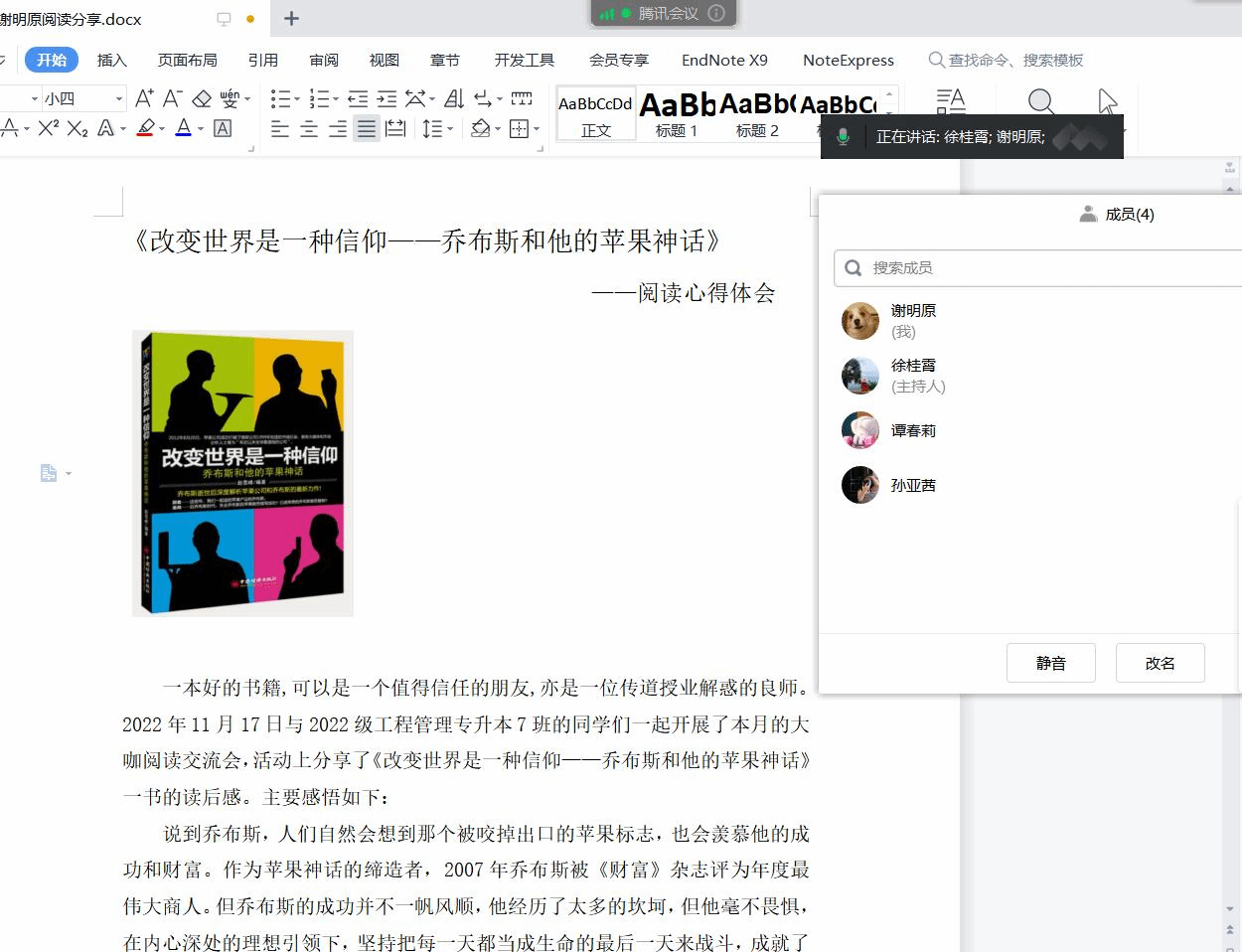 寒假期间,数字经济与信息管理学院的老师们在线上开展了大咖阅读分享会。其中谢明原老师分享的《改变世界是一种信仰——乔布斯和他的苹果神话》,关于这本书,谢明原老师分享到,对于乔布斯创办苹果公司在现在看来对于世界来说都是一个伟大的创举一点都不为过,因为他的确大大改变了现代人的生活方式,然而没有人是随随便便成功的,乔布斯创建苹果公司,不是一夜之间就取得成功的,过程也不是完全顺利,在这期间,他这个苹果公司的创始人,还被赶出过苹果公司。但我觉的这反而成为乔布斯二次创业最大的动力,书中还有这样描述乔布斯的一段话:“史蒂夫·乔布斯在别人眼里是一个态度强硬的谈判对手,每次谈判他都有一种一定要赢得信念”。我欣赏乔布斯的这种信念,就是这种一定要赢的信念,让他充满自信地面对所有的困难。每一个人,如果对自己所做的是没有足够的自信,又怎能让他人相信你能成功;如果你没有坚定的信念,又怎能在磨难面前勇敢地走下去。