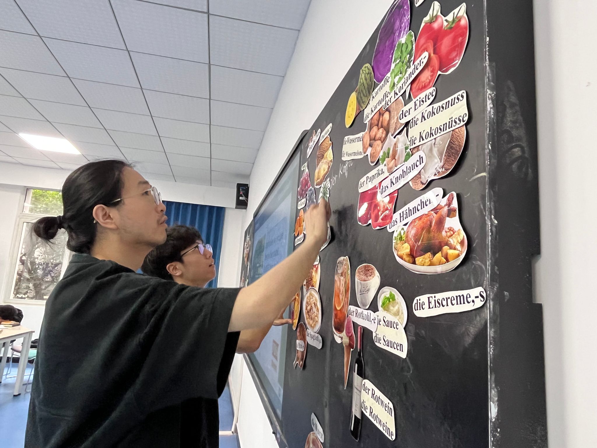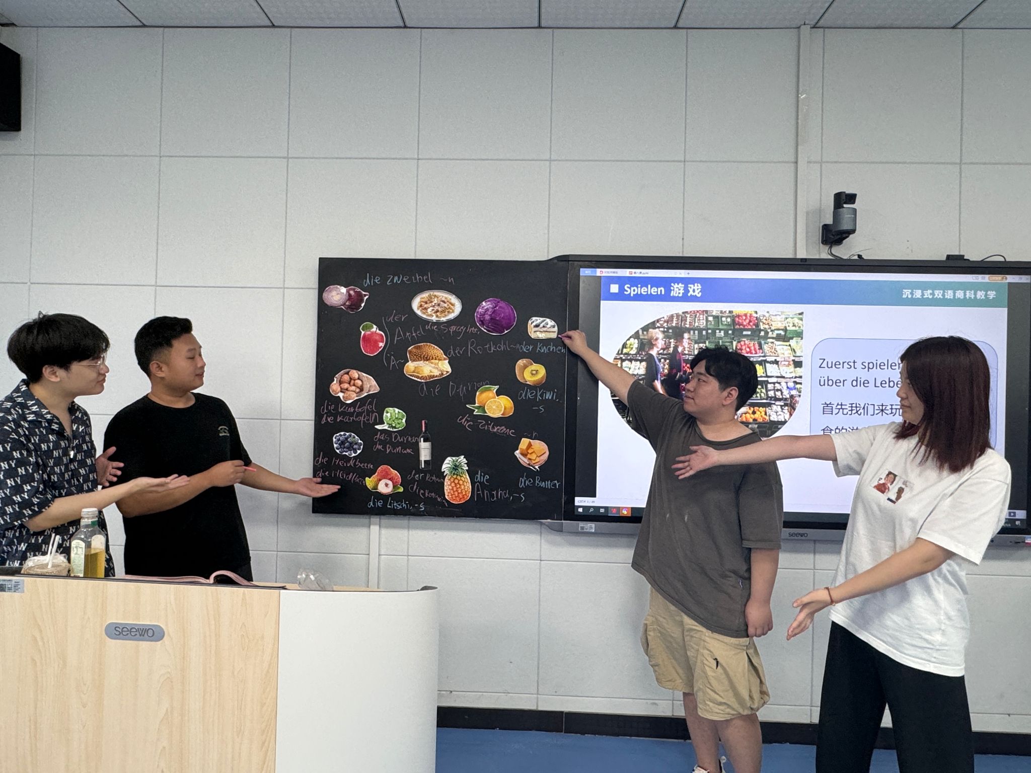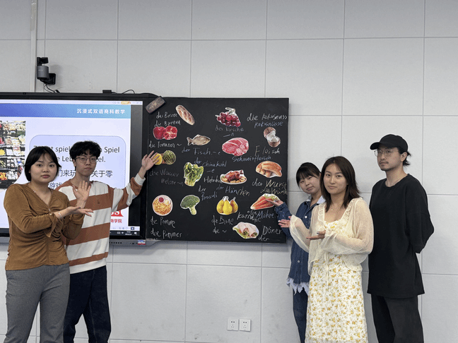 在国际化的浪潮中,语言学习不仅仅是沟通的工具,更是连接不同文化、拓展国际视野的桥梁。为拓宽学生的跨文化交际能力,5月8日上午在5205教室开展了一堂趣味横生的德语课。唐楚岑老师带领同学们模拟德国购物的真实场景,同学们将化身为德国消费者和营业员,通过角色扮演、模拟对话、实际交易等多种方式,运用日常生活中的交际德语,感受德国文化的魅力。