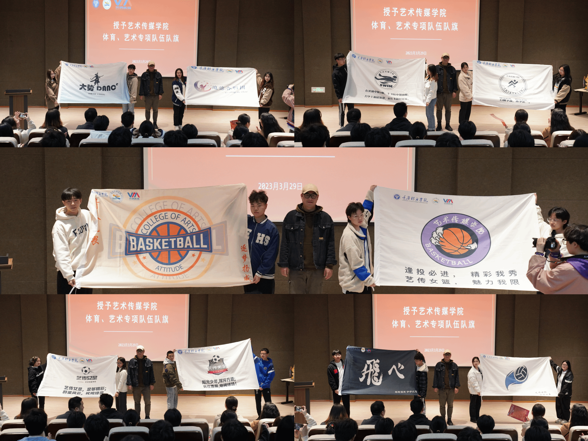 队旗标志着一个队伍的成立,是一个队伍文化、精神的传承,由艺术教育中心邹贤达主任为学院体育、艺术专项队伍授予了旗帜。各队队长和副队长依次上台接过队旗并向大家展示。