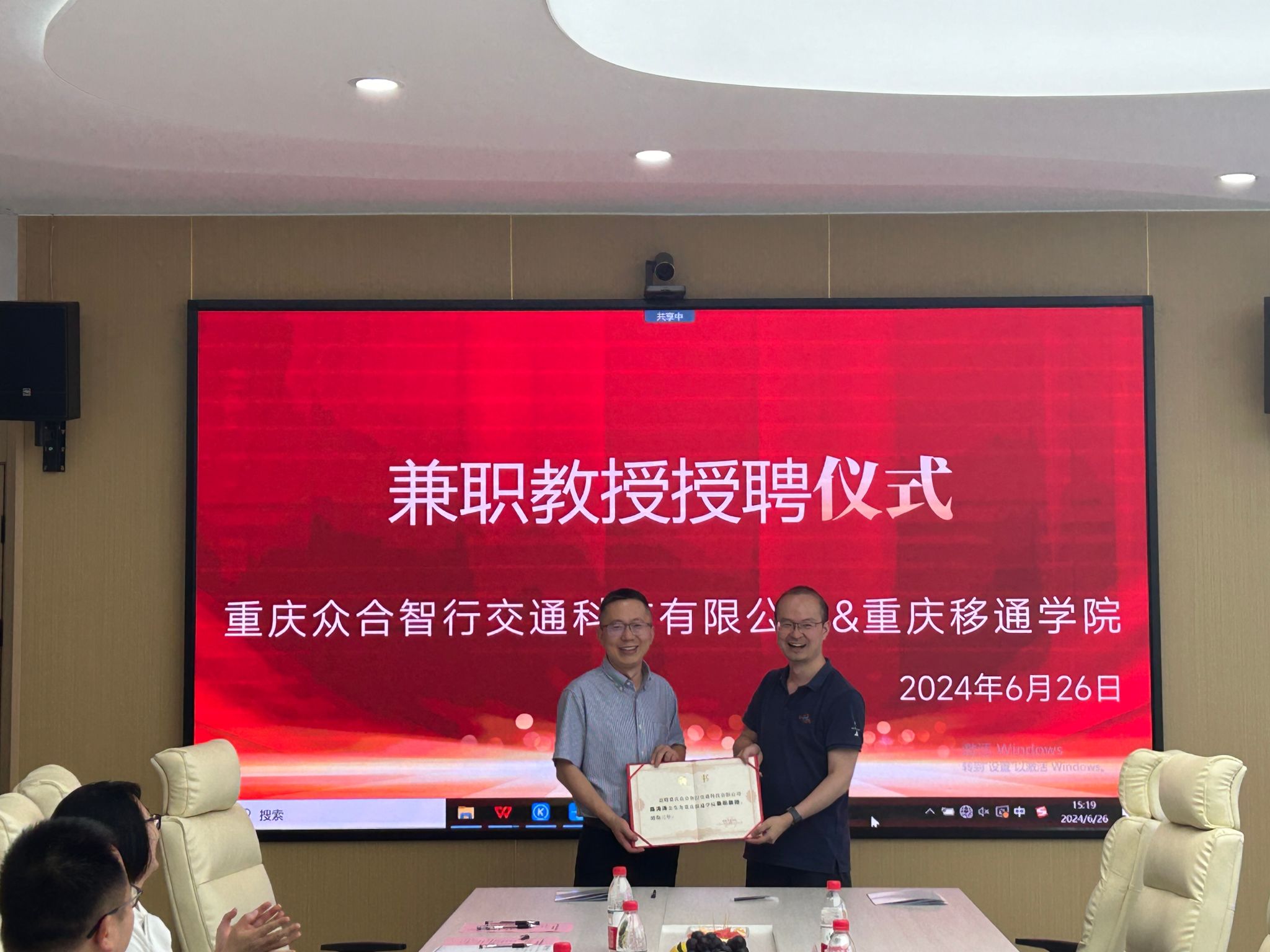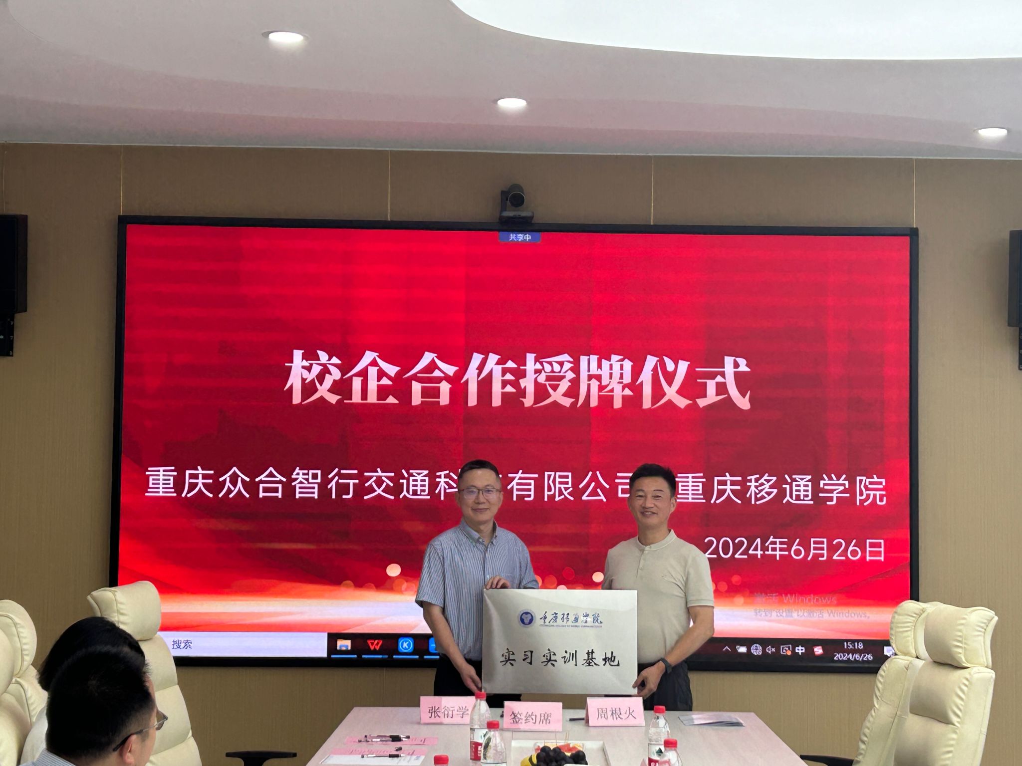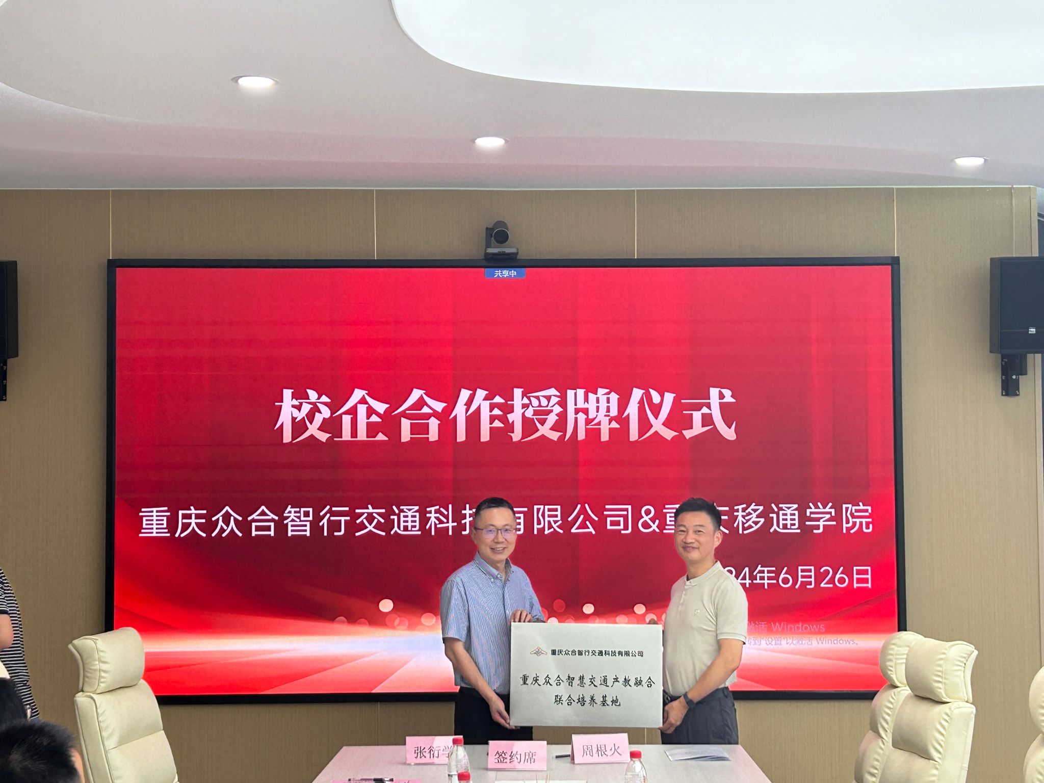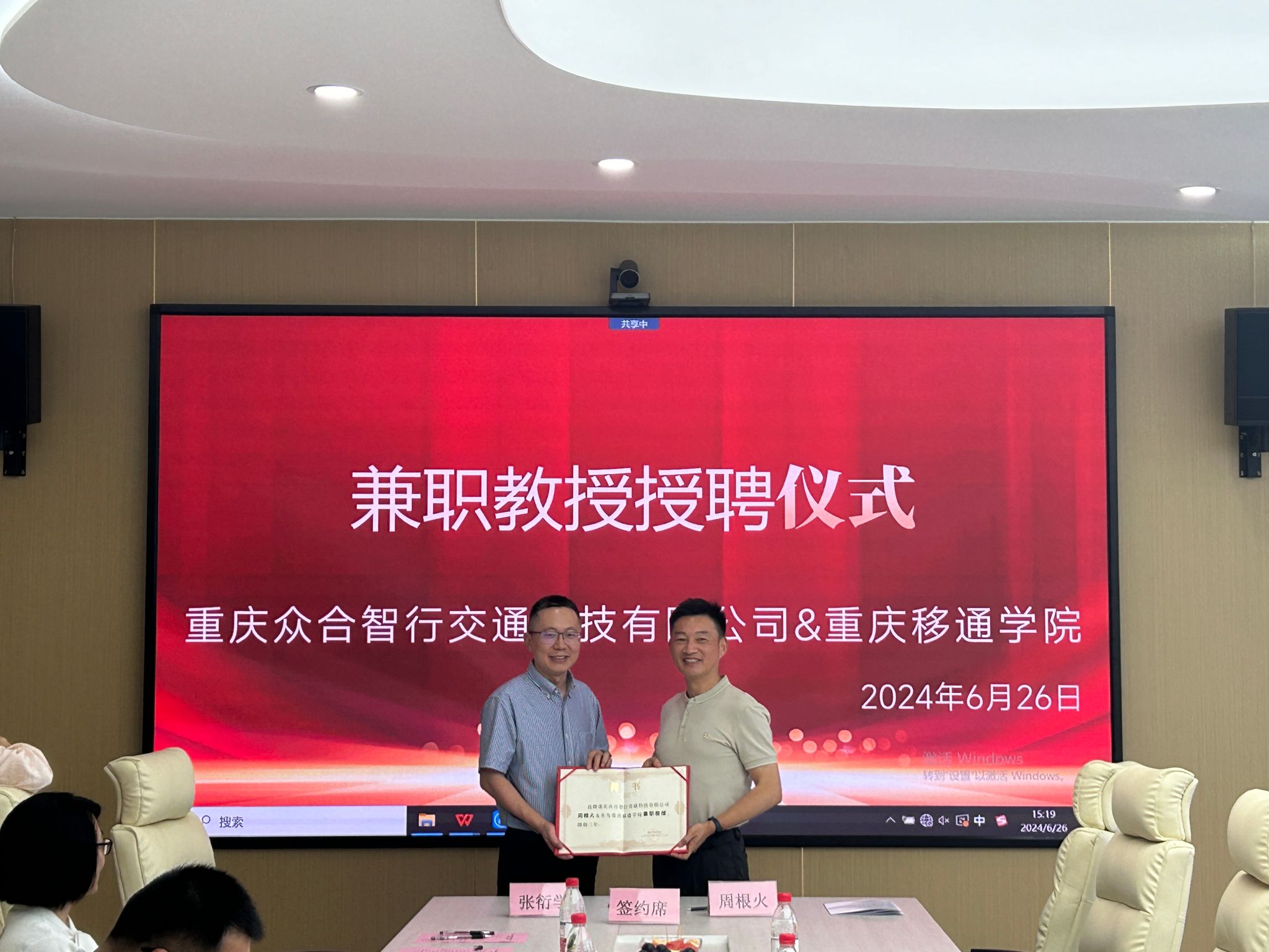 在双方的见证下,张衍学副校长和周根火总经理共同签订了校企合作战略协议,并交换了授予牌匾(“重庆移通学院实习实训基地”、“重庆众合智行交通科技有限公司产教融合联合培养基地”)。随后,张校长为周根火总经理和陈涛涛经理颁发了兼职教授聘书,聘任他们为重庆移通学院的兼职教授。