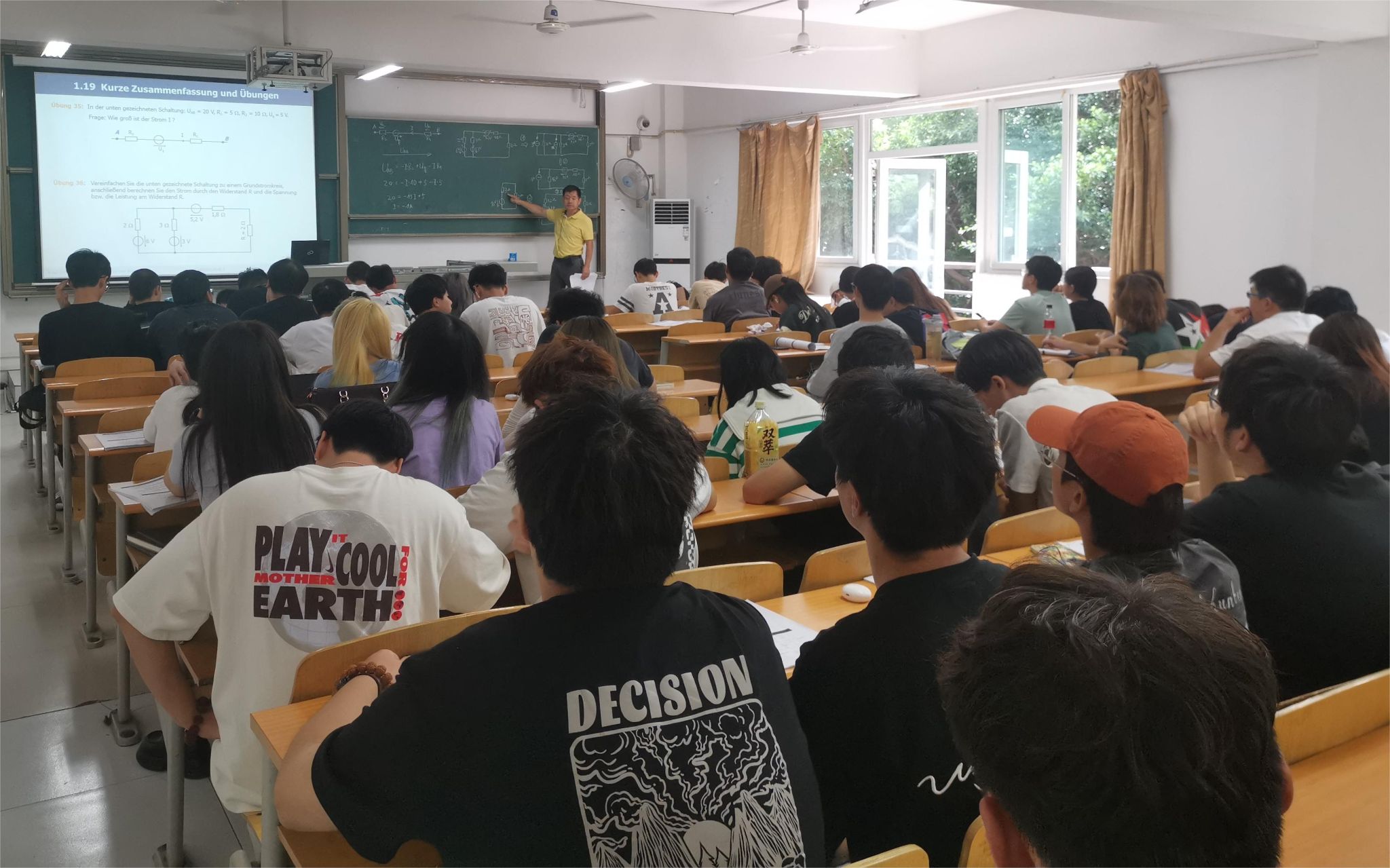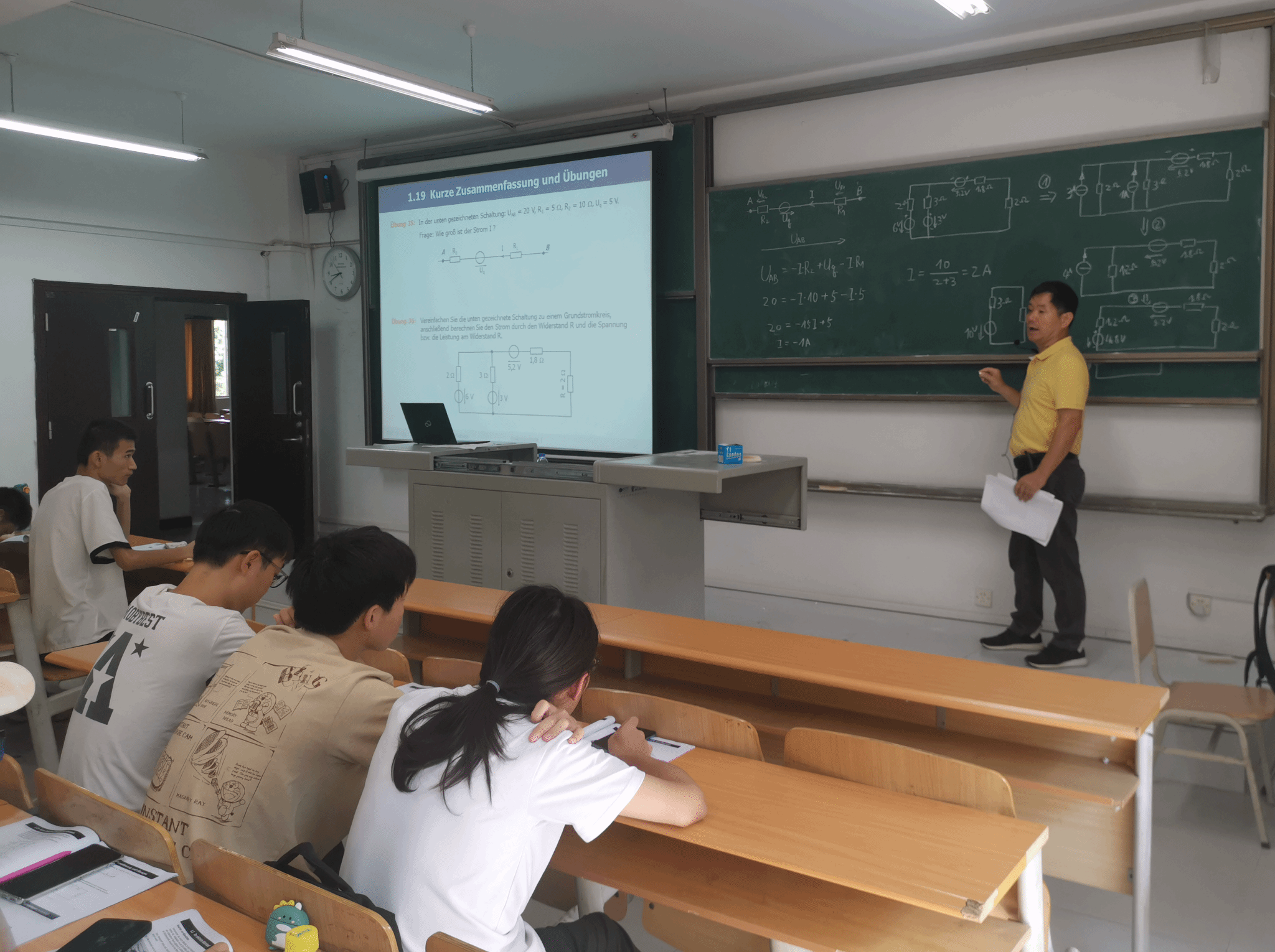 为保障合作项目外教课的顺利进行和高质量教学效果,我院选派了中方优秀的双语教师作为外教助教,以高度的责任感和专业度协助外教授课。此次,王瑞老师承担了《电路基础》助教一职。课前,王老师为学生打印了课程资料供学生预习;课中,王老师协助曲教授管理课程教学秩序并提供答疑帮助;课后,王老师集中为学生进行了考前知识复习和针对性练习。我院助教老师架起了中方和德方、老师和学生之间沟通的桥梁。此外,助教老师时刻保持和辅导员的沟通,及时反馈学生到课情况,并组织学生干部一起从课堂管理方面为外教课教学保驾护航,保证了学生和老师之间始终信息共享,促进了合作项目外教课的顺利开展。