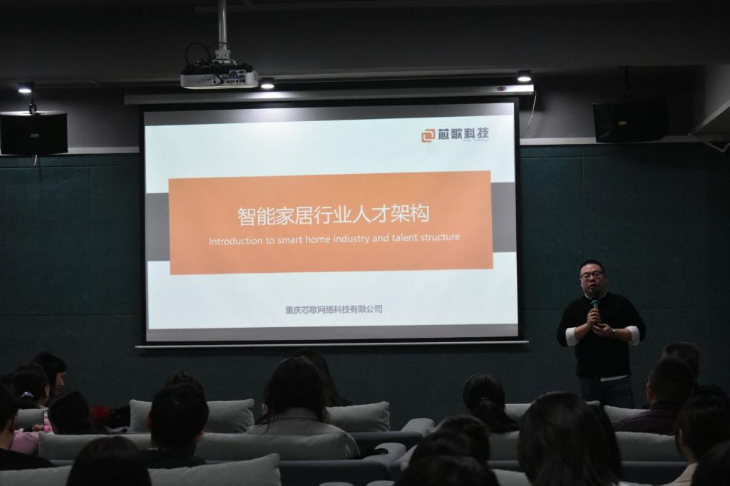 数字经济与信息管理学院数字经济研究院旗下“数智汇”系列活动第一期高管讲座于2020年10月21日如期举行了。主讲嘉宾来自2013级移通学院信息管理与信息系统专业的优秀毕业生、现任重庆芯歌网络科技有限公司创始股东副总经理刘建,他以“智能家居行业人才框架”为主题进行了报告分享。出席本次讲座的嘉宾有潘显兵院长、刘贵容副院长,以及数字经济与信息管理学院全体专任教师。
