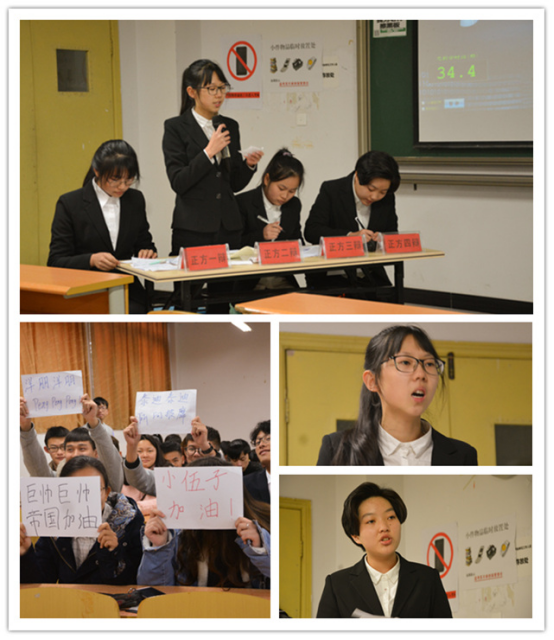 首先正方引用法国科学家说的话以及举出飞机的发展史来证明自己的观点,而反方则是据理力争,互不相让一丝一毫,经过第一轮的角逐,反方稍稍失利。接着正方提出了“伪创新”的论点,层层递进,展开激烈的舌战,而反方也不甘落后,多次陈述己方观点而提出不否认对方陈词来扰乱对方思绪,双方你往我来,简明扼要的提出己方论据,答辩现场越演越烈,在几个回合的比拼之下,反方拿下最终胜利。本次比赛以反方软工十三班帝国队获胜而画上圆满的句号。