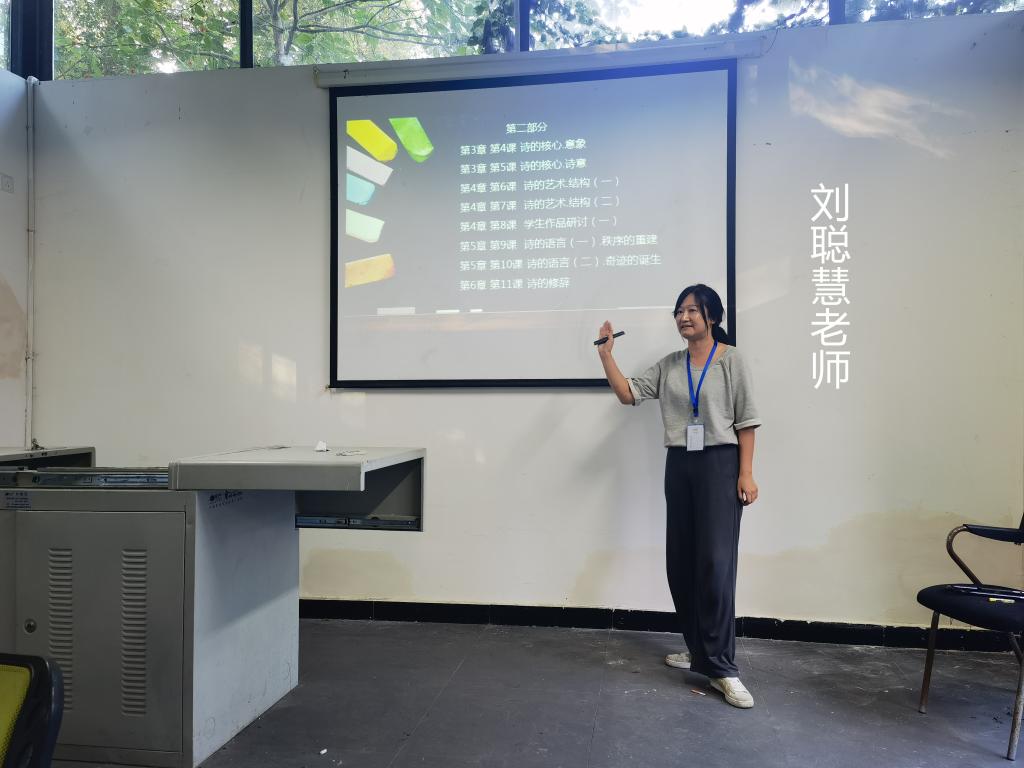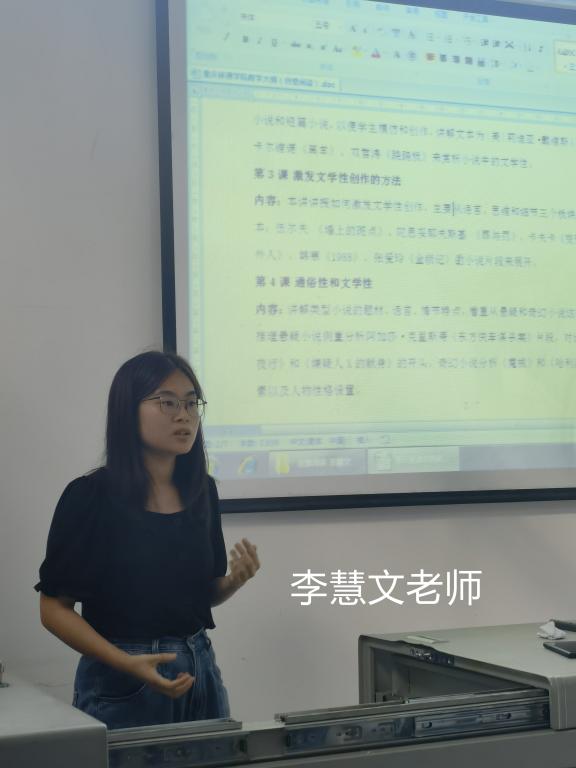 毕业于北京大学的创意写作硕士李慧文老师,大大方方上台,将该课分成四大板块,针对小说、戏剧、诗歌、散文四大文学体裁阅读分析和指导学生实践创作同步进行。条理清晰,“岗位”明确,知识点颇多,也是深得好评。