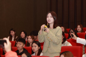 简单的交流过后,便是同学们期待已久的互动环节,现场瞬间被大家的呐喊声点燃。满席高举的手,张张充满期待的面庞,都表达着对电影的热爱和主创团队的认可。“悬疑类型电影以女性视角讲述,加入母爱的表达,是否有较大的挑战?”“看到剧本角色的第一感受”“如何拿捏角色的情绪”……主创一一解答了同学们的问题。最后,张末导演希望同学们不仅能从这个悬疑故事中感受惊险刺激,还能感受到女性独立勇敢。