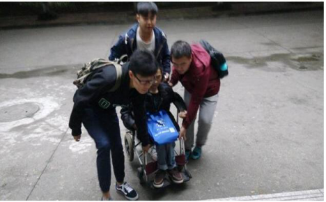 A6到教学楼的距离虽短,但志愿服务的道路却很长。风风雨雨,志愿者们和朱洪江同学一起走过,不会因为艰苦而停下。据支队长回忆,有一次他们送朱洪江上课,刚开始出寝室便下起了磅礴大雨。四个人只有一把伞,由于身体原因,朱洪江不能淋雨,于是志愿者们用仅有的一把伞为朱洪江遮雨。三个志愿者就这样一直淋着雨将他送到了教室。“虽然衣服湿透了,但是我的心里却是慢慢的快乐和成就感。”志愿者们这样说到。也许在别人看来有些无法理解,但是在春藤小组志愿者看来,因为我们的存在让朱洪江不再因不便而阻挡自己的求学之路,即使有艰辛都是值得的。