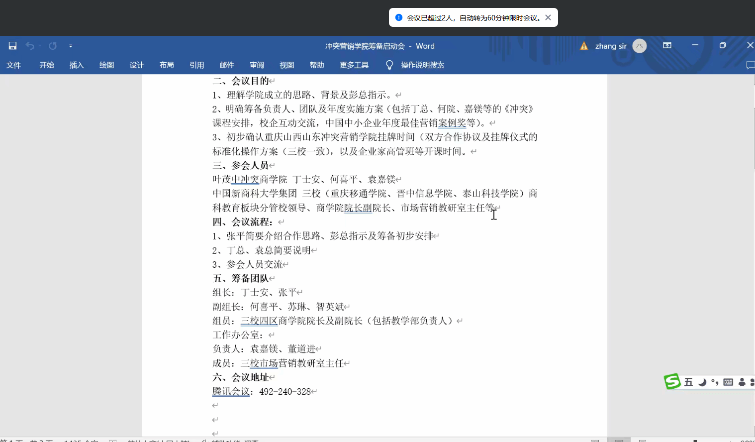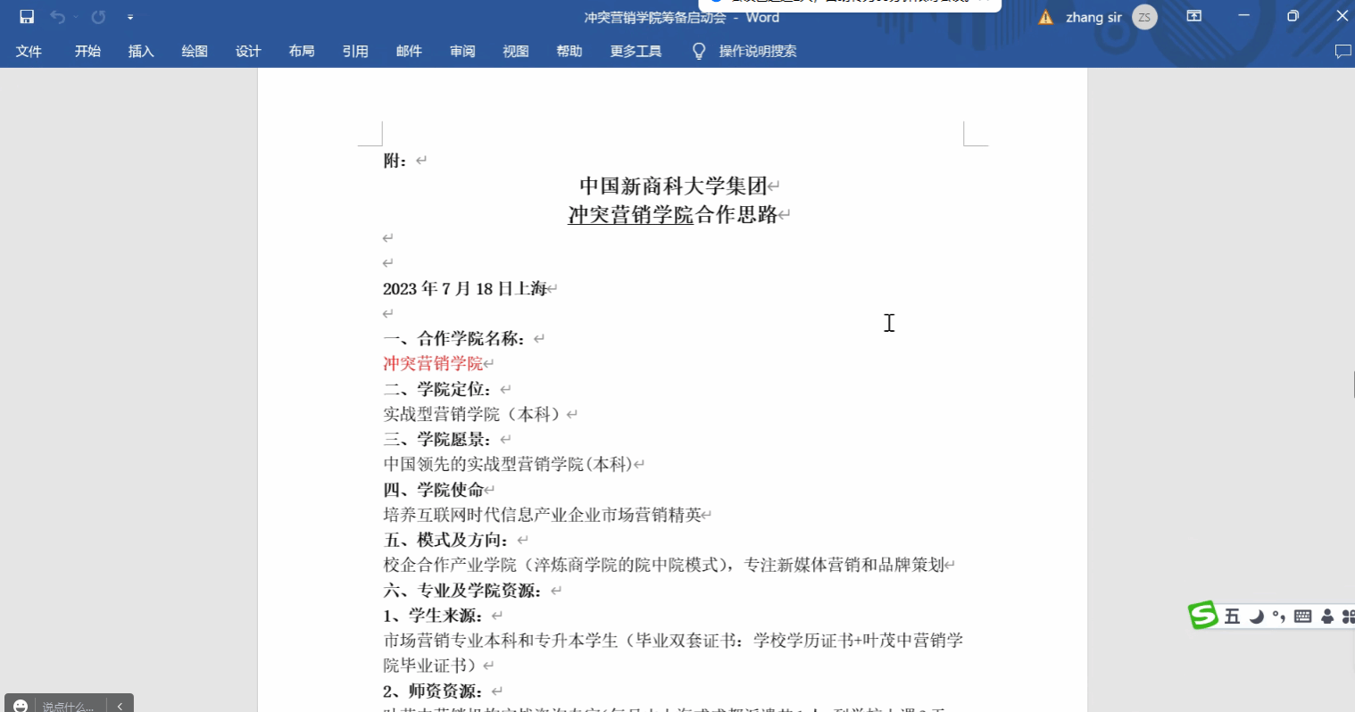 会议由张平主持。首先张校助介绍了冲突营销学院合作思路,对学院名称、办学定位及愿景、管理团队、管理模式、品牌推广等构想及彭总指示作了说明。