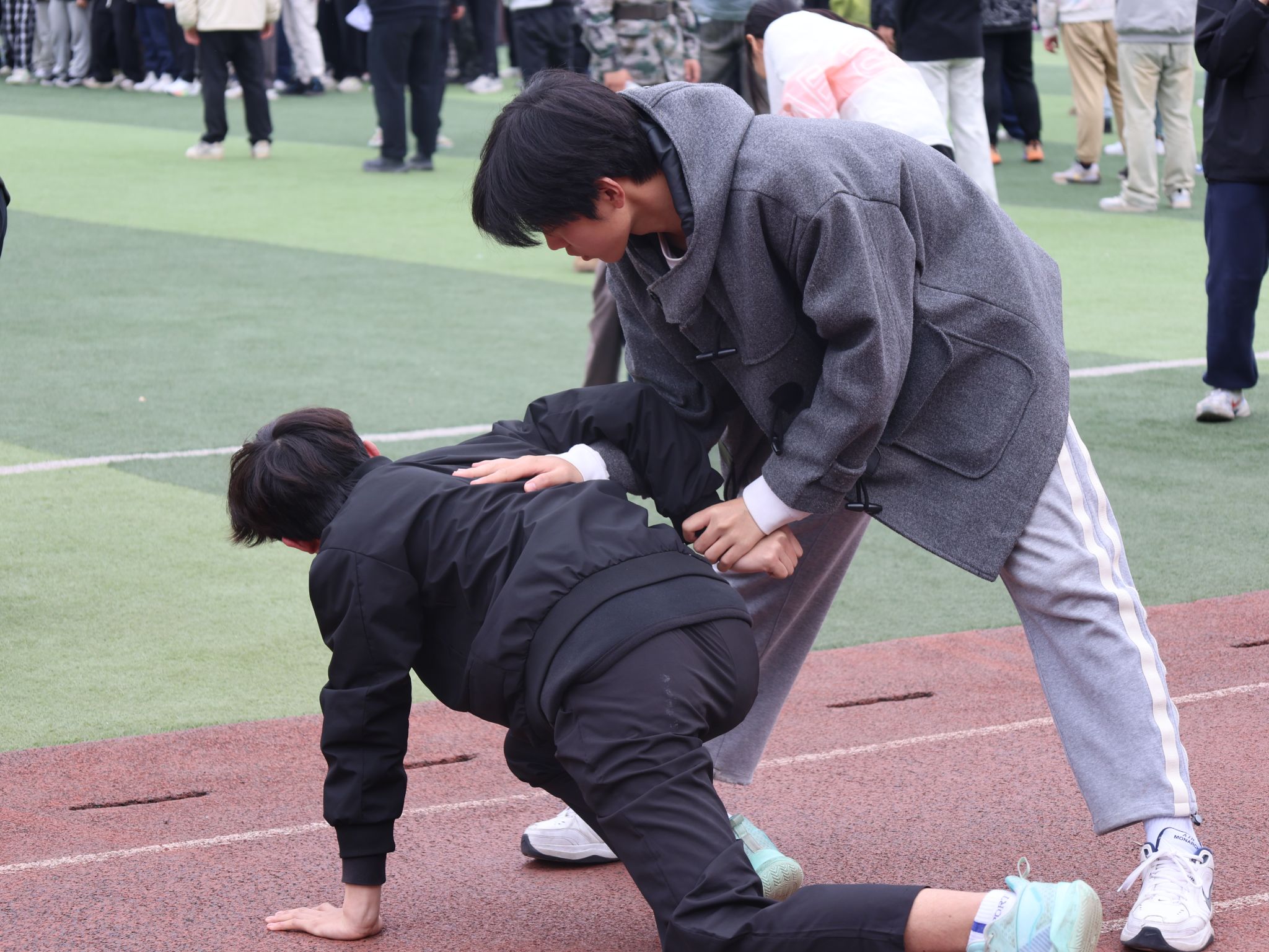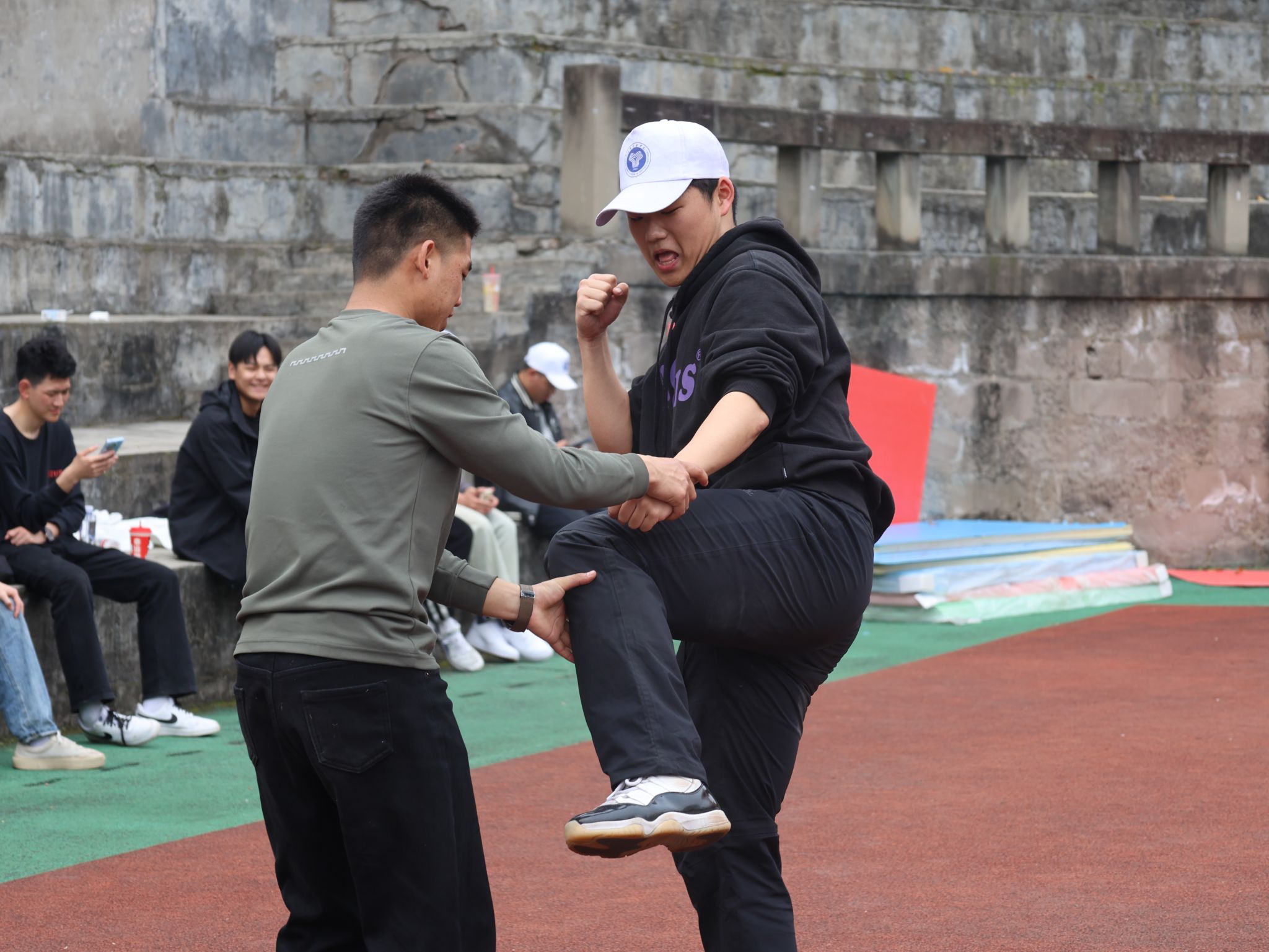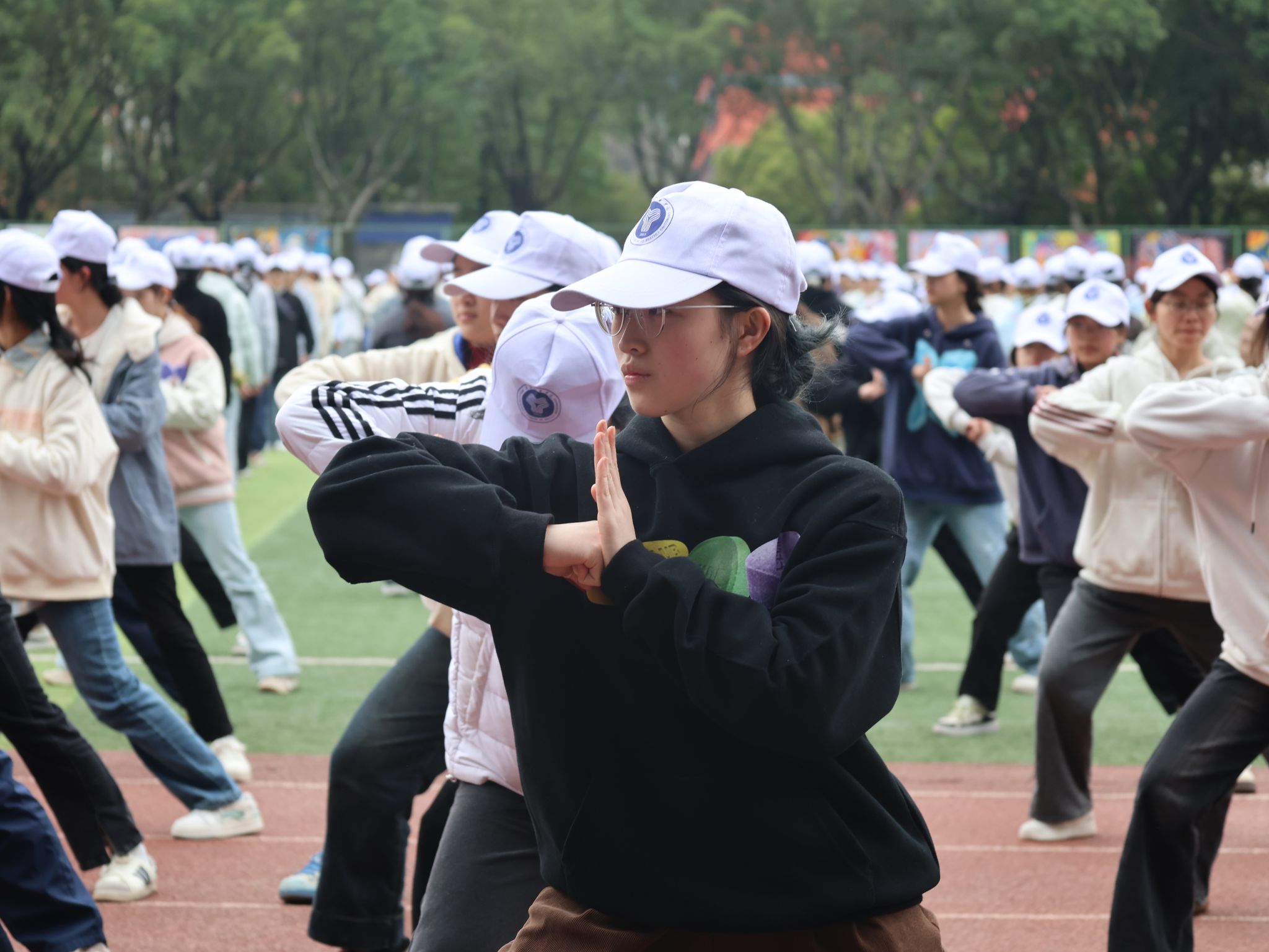 抬腿时带起的风,带过耳畔呼喊的口号,一起卷入尘埃。脚步声“哒哒哒”地砸在地上,格斗招数,手到擒来;军体拳术,气势如虹,连着操场的空气一起颤抖,抬腿、摆臂、落地,行云流水,整齐划一,小tip:别因为走神,而重复动作加加加。
