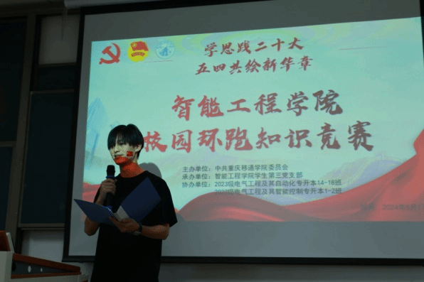 习近平总书记在党的二十大报告中强调:“青年强,则国家强。”为贯彻落实党的二十大精神,帮助在校大学生进一步把握时代对新青年的新要求,鼓励青年“立志做有理想、敢担当、能吃苦、肯奋斗的新时代好青年”,厚植爱国主义情怀,培育自立自强、敢于担当、敢为人先的精神,激发同学们将爱国之心、强国之志转化为报国之行的热情。5月17日下午14:00,由中共重庆移通学院委员会主办,智能工程学院学生第三党支部承办的“学思践行党的二十大,五四共绘新华章”校园环跑知识竞赛活动在9210教室及北校区行者公园成功举办。