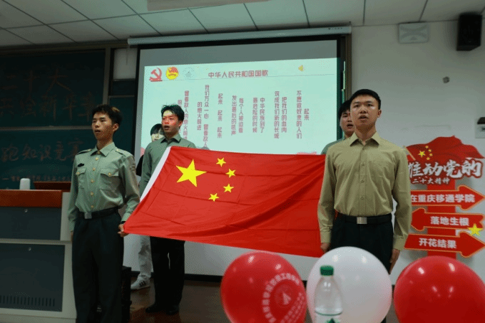 一抹华夏红,万千爱国情。活动伊始,由智能工程学院退役军人迎出国旗,奏唱国歌。随着激昂的国歌响起,全体师生庄严肃穆,注视着那一抹鲜艳的红色,铿锵有力的歌声中蕴含着浓浓的爱国情,同学们眼中藏着星光,肩上扛着梦想,心里憧憬着未来,展现着新时代新青年的风采。齐唱国歌环节虽短,却能感受到同学们对祖国深沉的爱意。