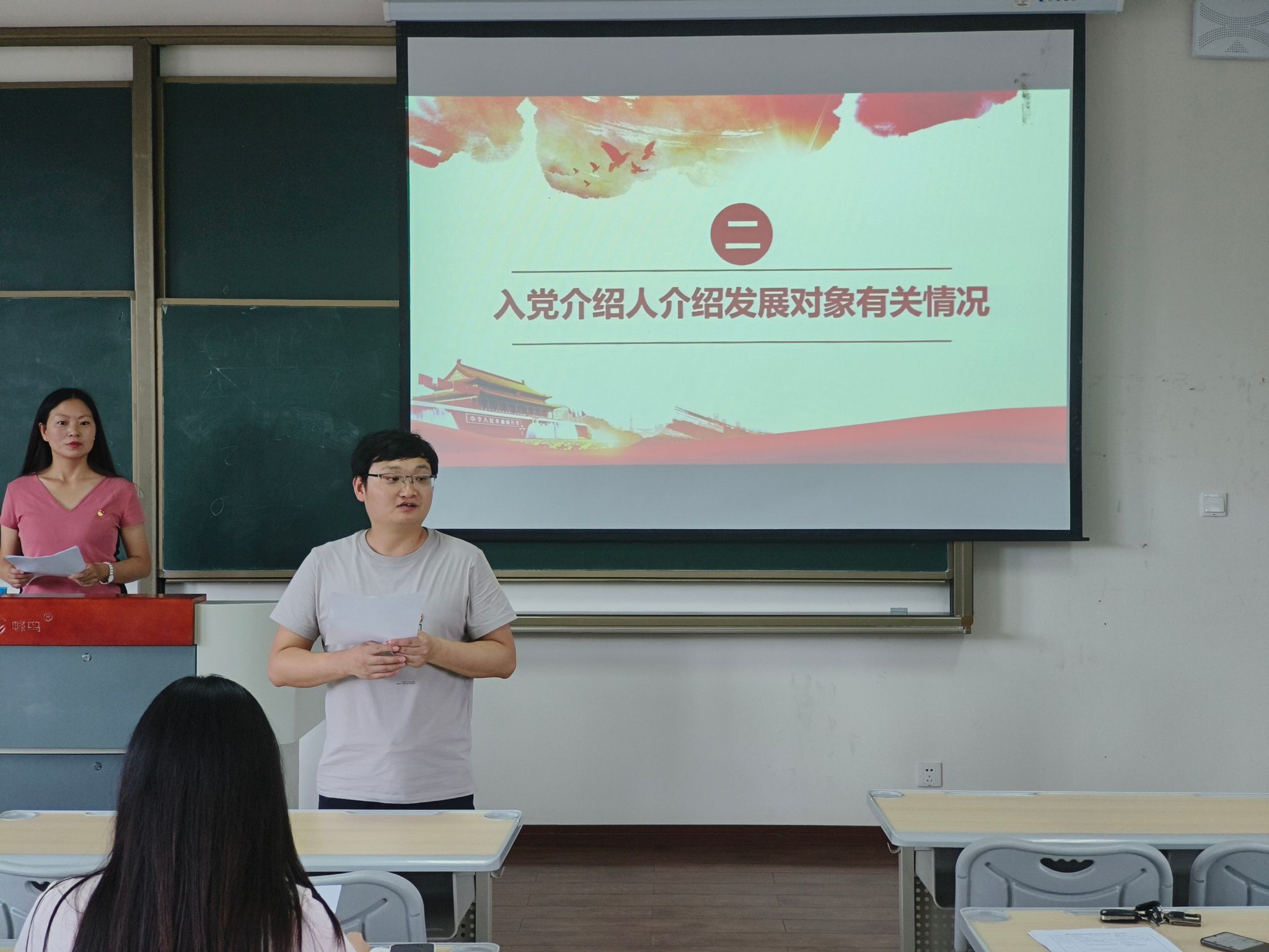 在会议第二部分,发展对象李竺奕同志宣读了入党志愿书,并向大会详细报告了自己情况,表示将在今后的学习和工作中坚定信念,时刻以一名合格共产党员的标准严格要求自己。随后,经过入党介绍人、支委会及与会党员的重重讨论,就对是否接收李竺奕同志成为预备党员进行了无记名投票,投票结果为党支部成员一致同意接收李竺奕同志成为中共预备党员。接着,李竺奕同志进行了入党宣誓。