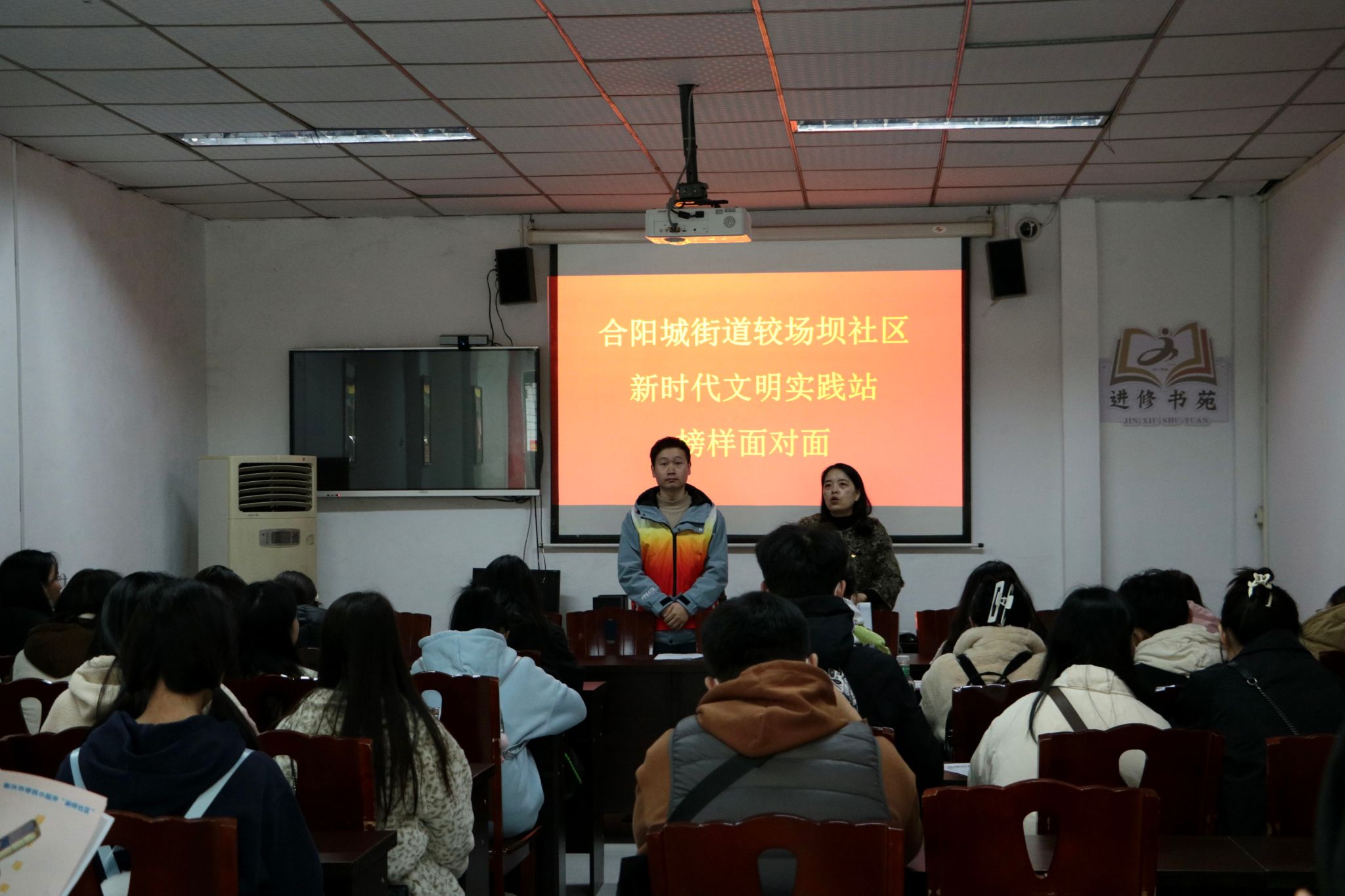 党建引领,学悟新思想。同学们在老师的带领下拜访了较场坝社区便民服务中心,进行了一场由党员组织引领的团员学习活动。通过活动现场的ppt介绍以及社区人员的生动讲解,同学们深入学习了最新思想、社区榜样,更是从不同层面领悟到社区服务的发展迅速,力求更加便民化地解决每家每户的生活问题,给予最优解决方案。